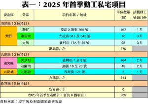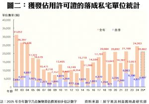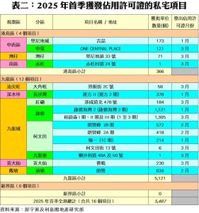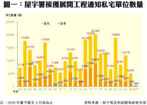 此外,私人住宅落成量方面,根據屋宇署今日最新發表的資料月報顯示,2025年三月份全港共有9個項目,合共1,977個私人住宅單位落成(以屋宇署發出佔用許可證的樓宇數量為準),按月增加22%,亦是近三個單月最多;今年首季累計共5,487伙私宅落成,較去年同期的4,977伙增加10%。