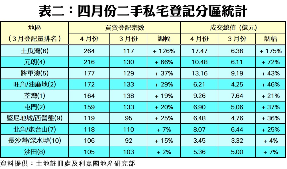 按全港三區作分析,四月份港九新界三區登記量全線上升。當中,港島區登記量按月升17%,月內錄794宗登記;九龍區按月大增36%,錄得1,224宗登記;至於新界區也升33%,多達1,634宗。另外,十大最活躍成交分區的登記量則錄得全線上升,當中以土瓜灣區的漲幅最大,月內錄得264宗登記,按月大升1.26倍。至於元朗區及將軍澳區亦分別錄得66%及37%的升幅,前者錄得216宗,後者則有177宗登記。