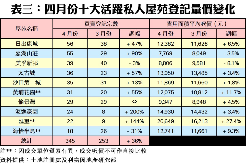 此外,上月十大活躍二手私人屋苑登記量中,錄得七升、一平及兩跌,其中以海逸豪園的升幅最大,月內共錄24宗登記,按月大增2倍;其次匯璽也升1.44倍,四月共錄22宗登記,而嘉湖山莊也漲90%,共錄55宗登記,成為登記量第二活躍的屋苑。至於,登記量錄得跌幅者,以海怡半島萎縮幅度最大,按月少31%,只得18宗登記;而美孚新村及愉景灣則分別微跌3%及持平,各自有39宗及29宗登記。此外,四月份十大活躍屋苑總計登記量共有345宗,較三月份的253宗大升36%,當中以日出康城的56宗最旺。