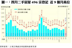 利嘉閣地產研究部主管陳海潮表示,政府於二月底發布的《財政預算案》中提及進一步將100元印花稅涵蓋至400萬元以內住宅物業,矢志紓緩上車客置業負擔;再者,上一期「白居二」准買證亦於期內屆滿,不少居屋客抓緊時機,並趁政策之便匆匆入市,帶動二手居屋交投顯著上升。根據土地註冊處最新數據顯示,四月份全港錄得496宗居屋二手買賣登記(數字主要反映三月中旬至四月上旬居屋第二市場及自由市場市況),較三月份的366宗按月彈升36%,連升兩月,逼近500宗水平;至於期內成交總值錄約18.7億元,較前月的13.88億元,按月同步增加約35%,登記量及總值均創近九個月新高。