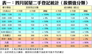 按樓價作分析(見表一),6個價格組別交投量全線上升,其中升幅最大的是價值200萬元以內組別,四月份共錄23宗二手居屋登記,按月急增1.09倍或12宗;至於登記量最活躍的300萬至400萬元以內組別則錄246宗,較三月份的155宗亦大升59%。如以地區劃分,九龍區四月份錄151宗登記,按月激增72%;新界區期內錄297宗,按月增加29%;至於港島區則錄48宗,按月微增2%。
