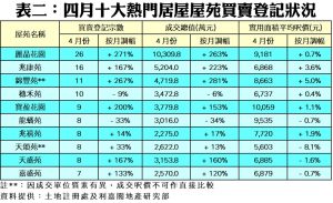 如按屋苑細分(見表二),四月份九龍灣麗晶花園以26宗買賣登記高踞榜首,登記量按月攀升2.71倍或19宗;上述屋苑同月登記總值更突破億元關口,涉資約1.03億元。緊隨其後的屯門兆康苑及馬鞍山錦豐苑則分別錄16宗及11宗登記個案。