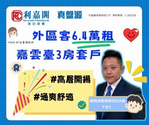 利嘉閣地產東半山跑馬地希慎道分行A組分區董事梁國樑(Stephen)稱,該行客戶董事邱柱杰(Fat)日前促成東半山渣甸山嘉雲臺3座高層B室的二手租賃成交個案,單位實用面積約1,439方呎,採3房1套連儲物室間隔,外望開揚景觀。