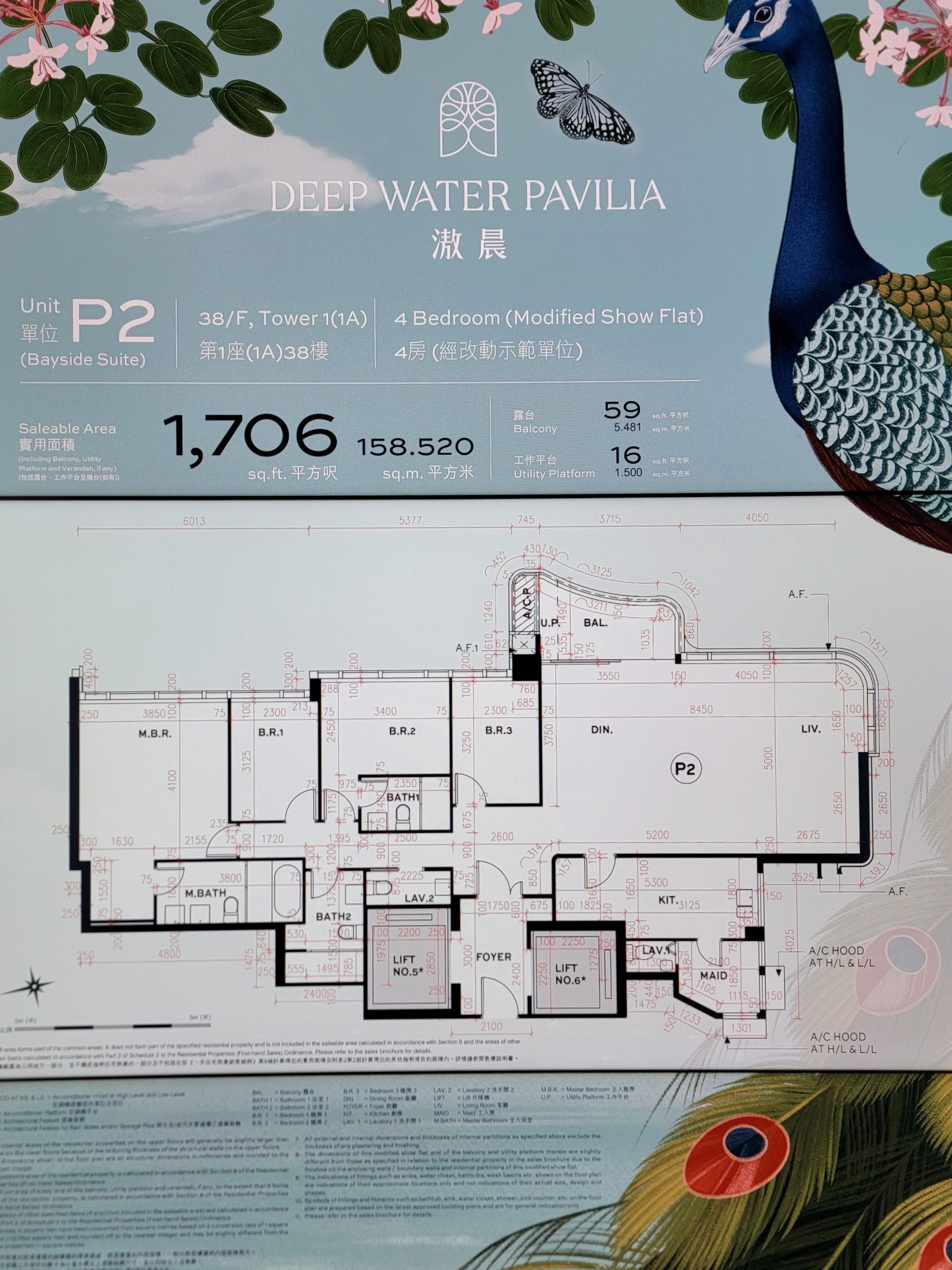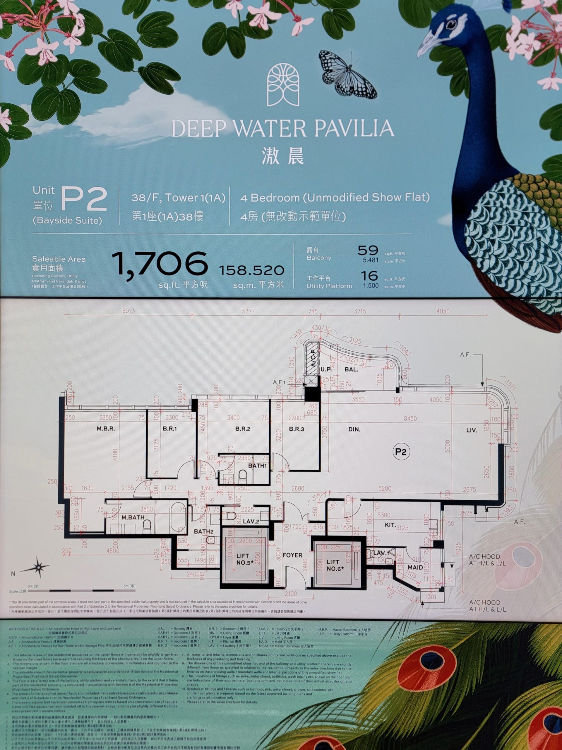 第1座 (1A) 38樓P2單位,實用面積1,706方呎,層與層之間高度為3.3米,原則屬於四房兩套及工人房連洗手間間隔,由知名室內設計事務所NCDA設計,經改動後間隔改成三房兩套及工人房連洗手間間隔。客廳連飯廳共長約8.45米,闊約5米,寬廣的橫廳設計盡顯氣派,與室外山海互持的景致完美配合。