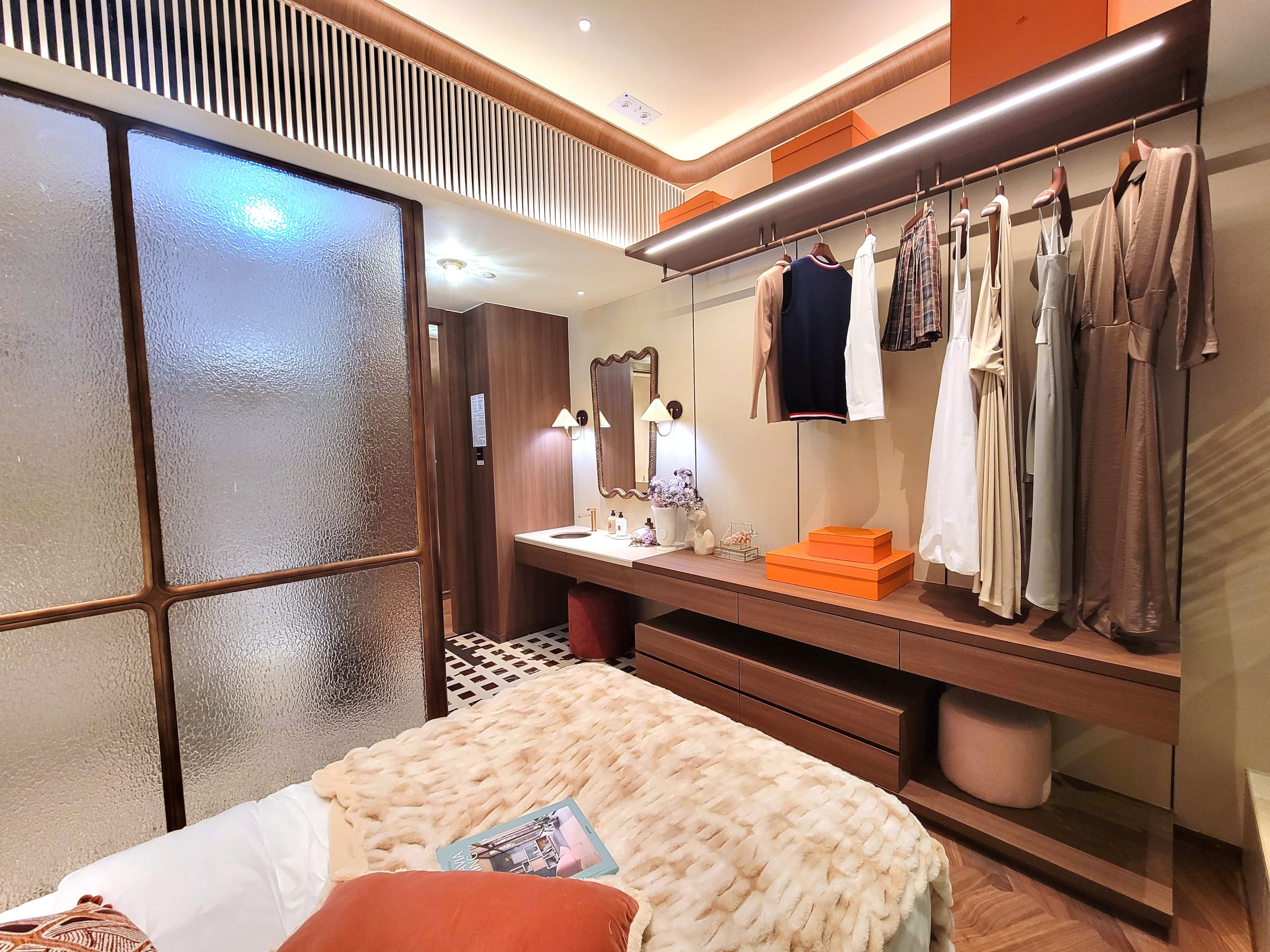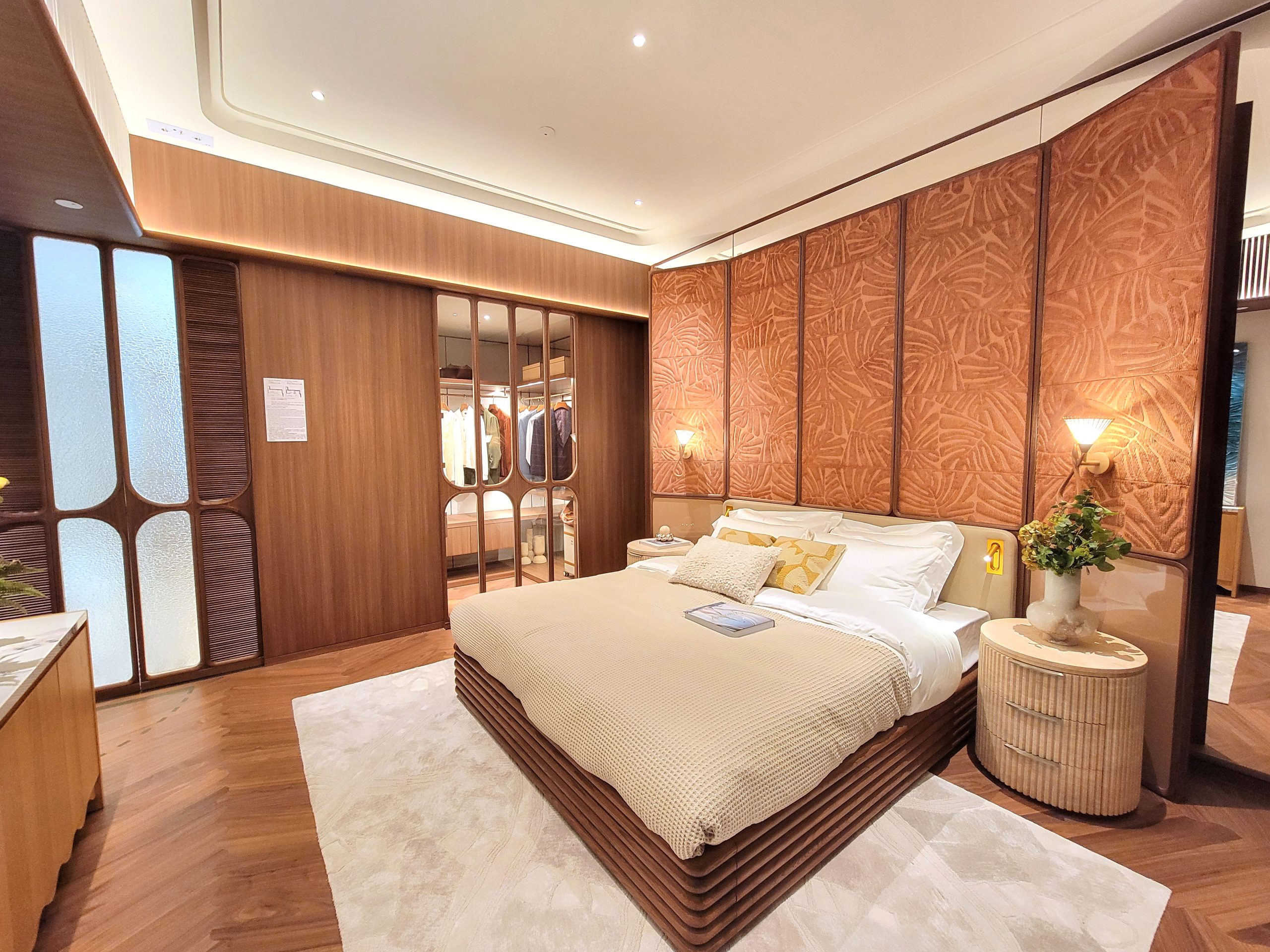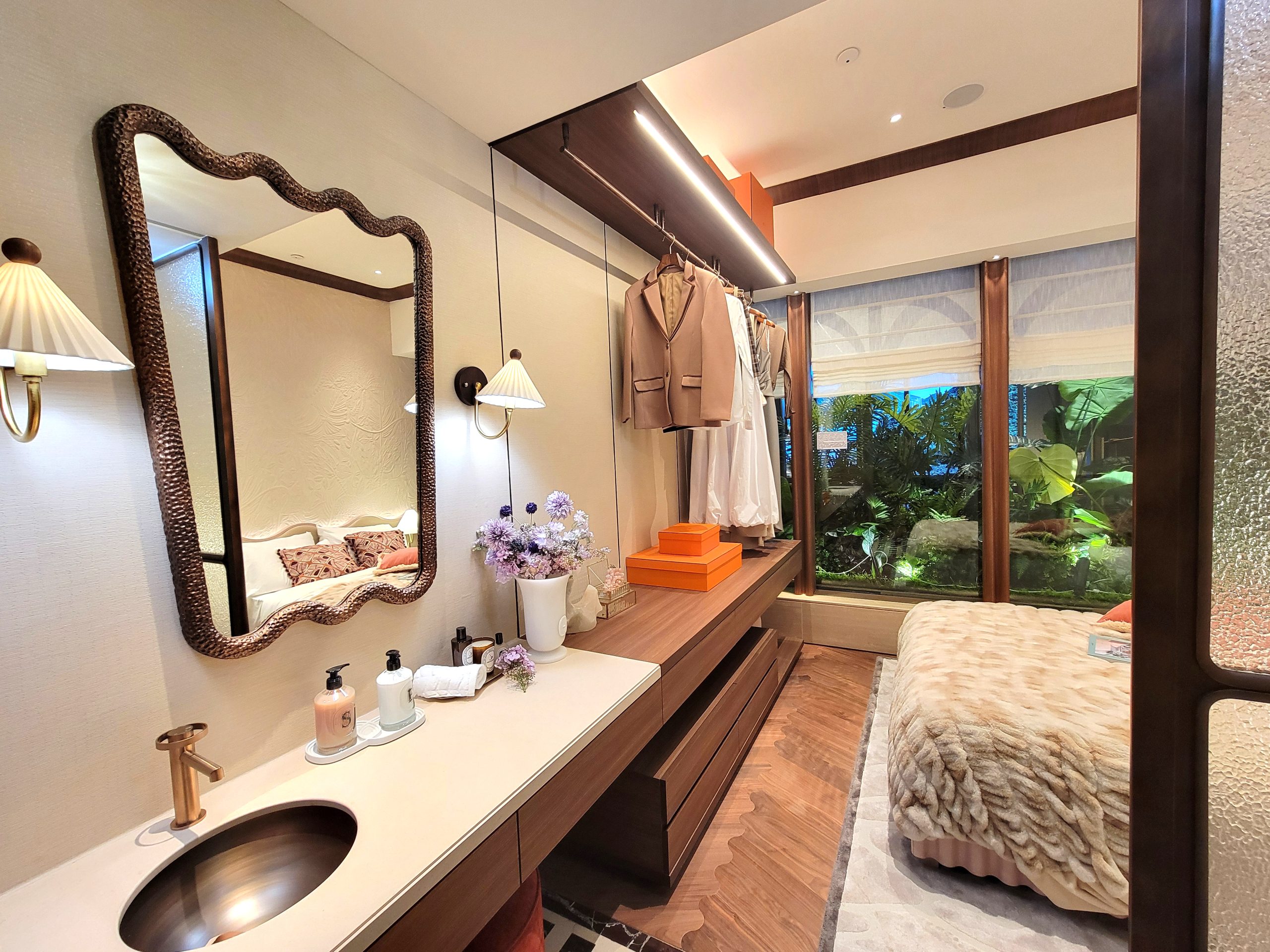 主人睡房則以酒店式設計為靈感,提供舒適的居住體驗。主人睡房配有高質感衣櫃組合,並設有趟板,以便隨時保持空間整潔與私密性,並將自然美融入日常,更增添居住的親切感。