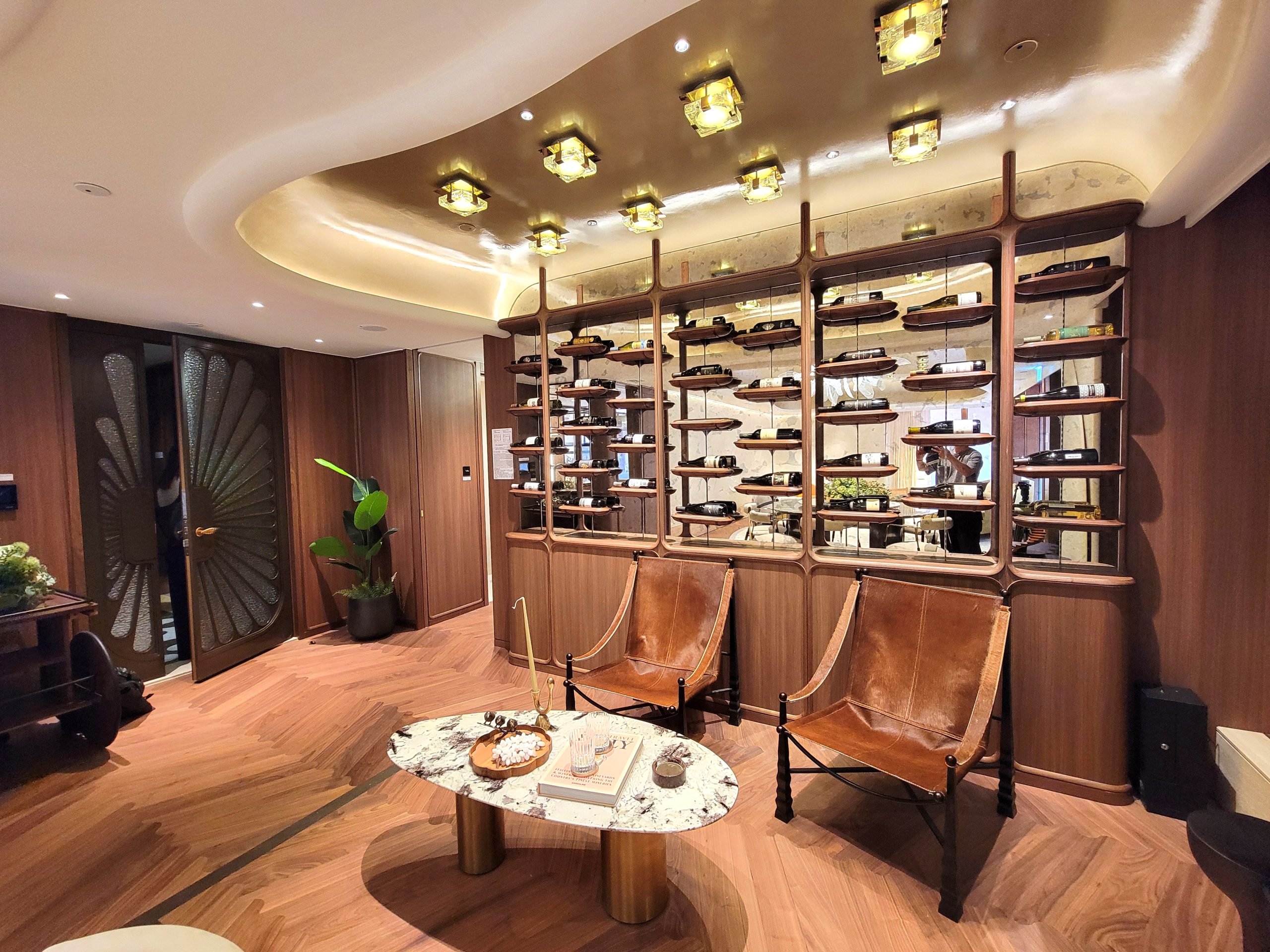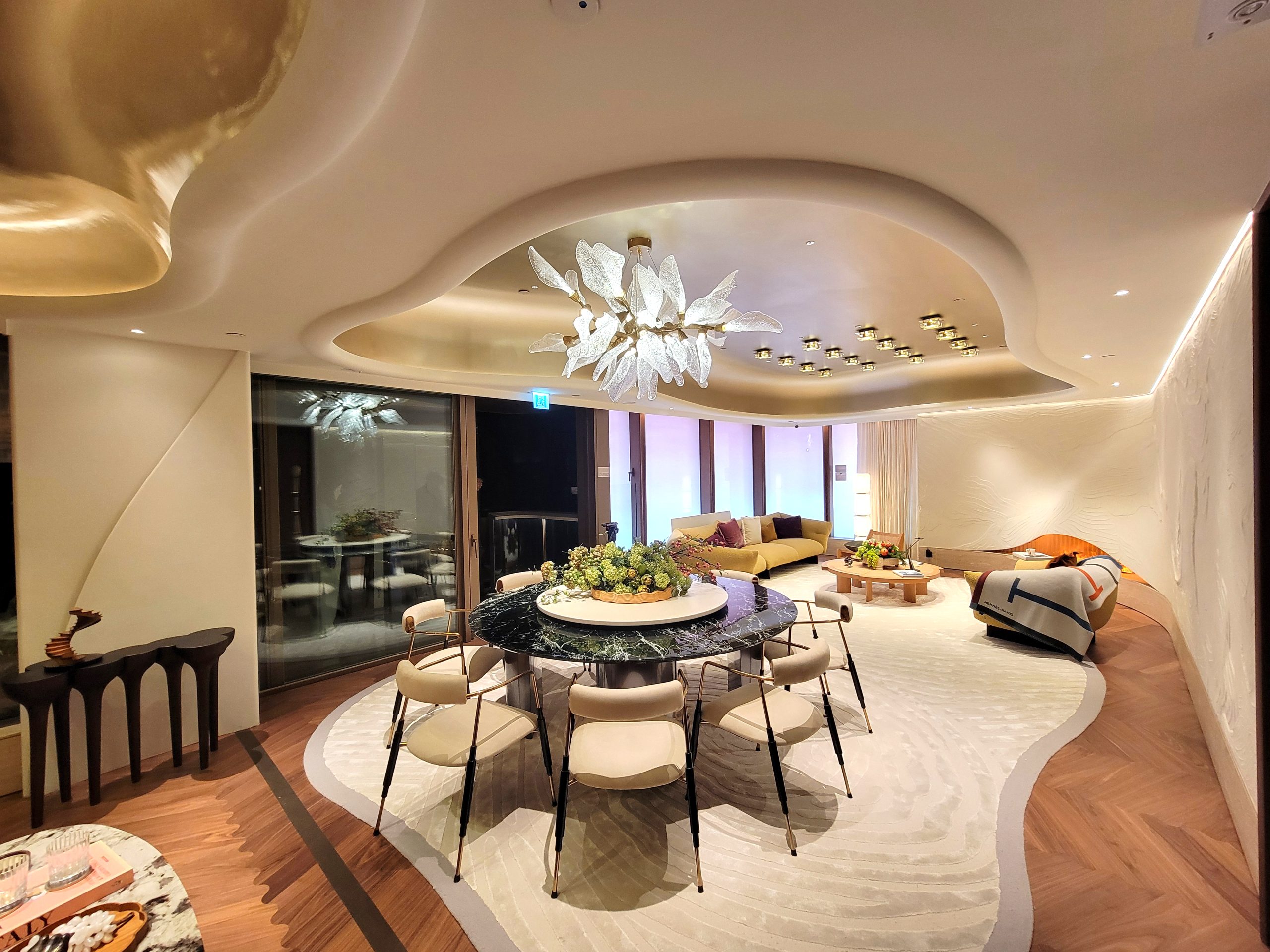從單位的客廳、飯廳及各睡房向外望,可以飽覽深水灣及遠眺壽臣山,美景盡入眼簾。客廳放置兩組弧形大梳化,與弧形假天花互相呼應,配合壁爐裝飾,營造視覺焦點,氣派非凡。飯廳的大型餐桌,方便住戶宴請親朋,酒櫃井然有序陳列美酒佳釀,住戶可以坐於酒櫃前細味品嚐。