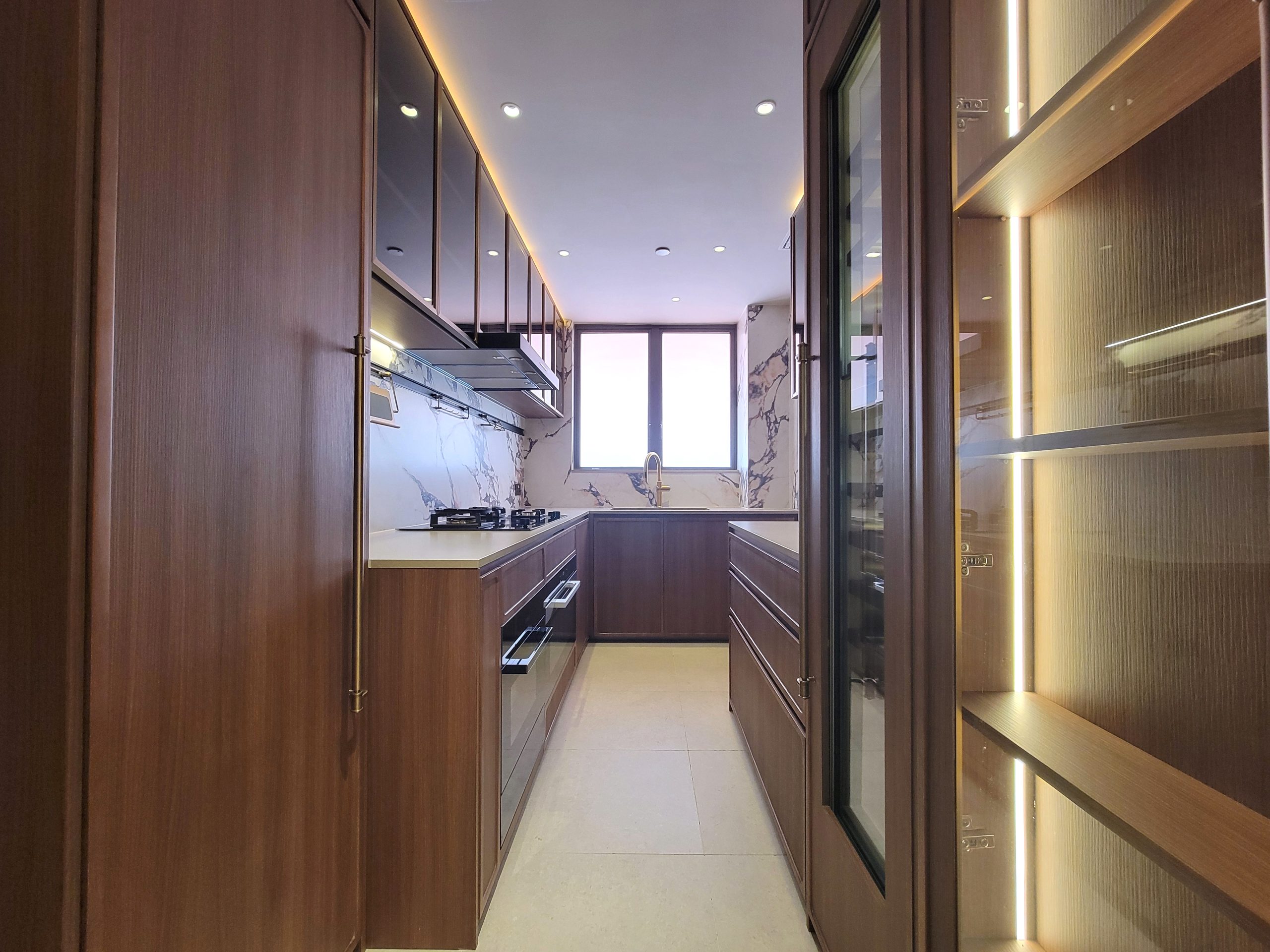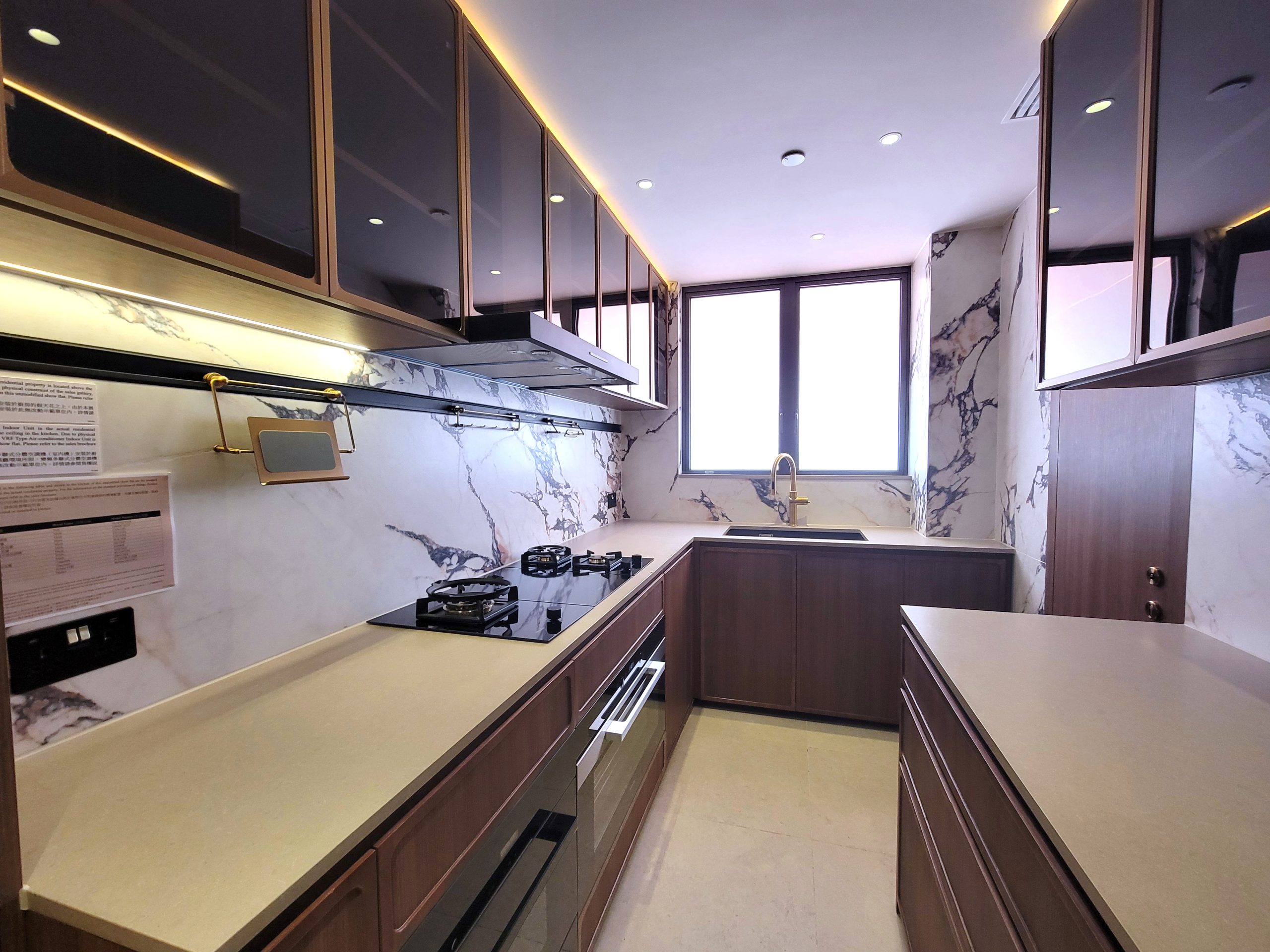 廚房為梗廚設計,以金銅色為主調,流露高貴雅致品味。配置Miele廚房家電,包括雙頭電磁爐、炒鑊氣體煮食爐、雙頭氣體煮食爐、蒸爐、焗爐、食物保溫櫃及嵌入式洗碗碟機等,更設Gaggenau 70支酒櫃,滿足住戶品酒雅趣。