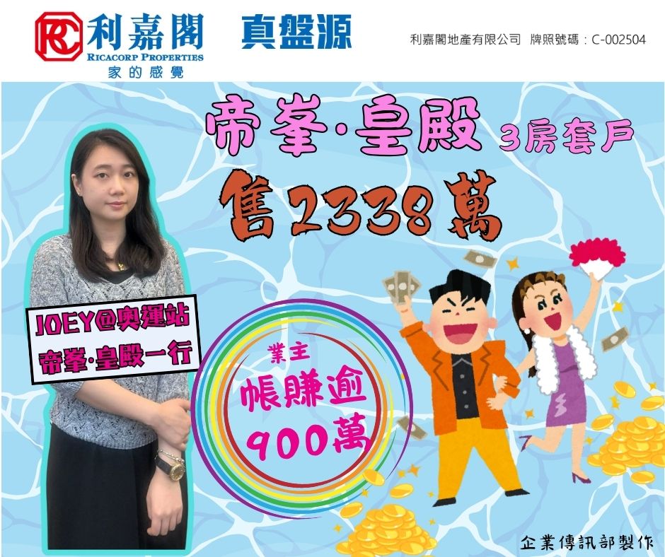 據悉,原業主於2010年以約1,397.3萬元一手買入單位,持貨至今轉售,現帳面大幅獲利約940.7萬元,期內物業升值約67%。