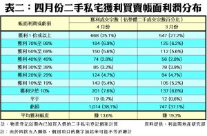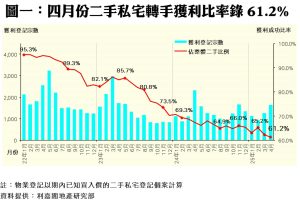 另外,數據顯示今年四月份每宗私宅轉手個案平均賺幅只得13.6%(見圖二) ,單月再挫5.7個百分點,連跌兩月兼創自2009年七月以來的190個月(即接近16年)新低。帳面獲利1倍或以上的轉手個案佔整體二手私宅買賣比例達25.1%,按月跌2.1個百分點,錄668宗;至於帳面錄得虧損者達1,014宗,佔比按月增加1個百分點,至38.1%,為2009年二月以來195個月(即逾16年)最高;至於上月平手的個案有19宗,佔比微升0.1個百分點至0.7%。