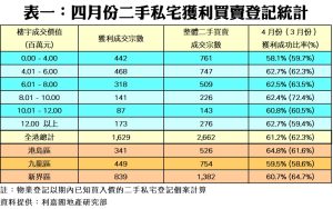 按物業區域劃分,四月份港島區表現屬最好,以64.8%之數成為獲利成功比率最高的分區,按月升3.2個百分點;其次為新界區,報60.7%,惟按月跌4個百分點;至於九龍區表現遜於大市,只錄得59.5%,惟按月微升0.9個百分點。按物業轉售價格分析(見表一),樓價1,200萬元以上組別之獲利比率最高,錄62.7%,按月升3.3個百分點,涉及宗數173宗;此外,401萬至600萬元組別,月內獲利比率也達62.7%,按月升0.4個百分點,同樣優於大市表現。