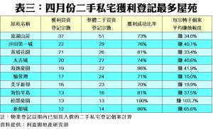 此外,檢視上月10個獲利登記最多的屋苑,當中只有柏慧豪園一個屋苑錄得百分百獲利,次高者為海逸豪園的86.4%,第三則為新都城的85.7%。此10個屋苑當中,每宗平均賺幅介乎最少的10%至最多的103.7%不等。其中,柏慧豪園錄得每宗轉手平均賺近1.04倍,為表現最佳的屋苑;至於新都城及海逸豪園也分別平均賺65.6%及41.9%。不過,愉景灣表現相對遜色,平均每宗轉手只賺10%(見表三)。