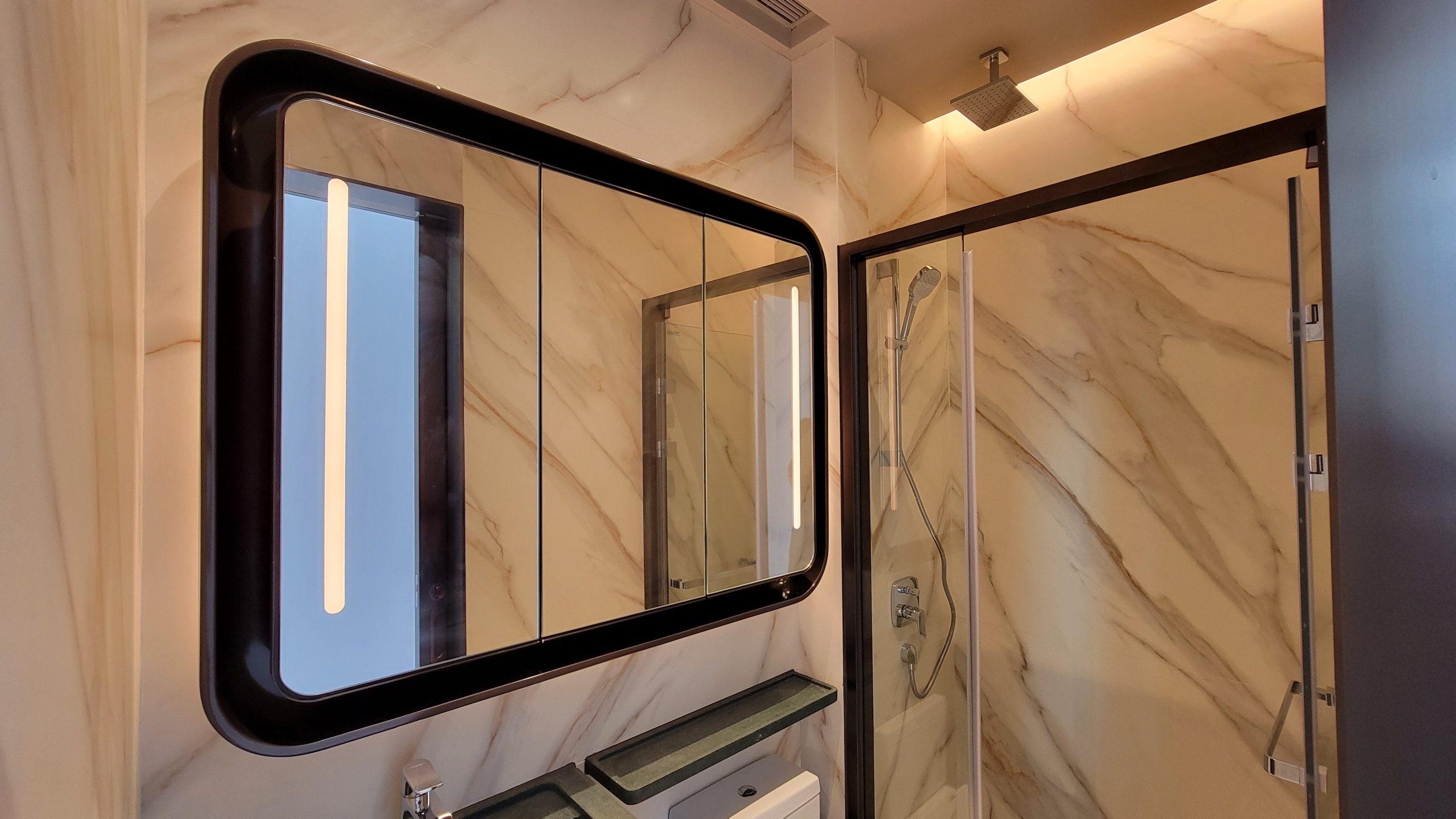 廚房採用開放式設計,單位精選高級電器品牌,包括德國品牌西門子及Miele等,設備完善。浴室以米白色為主調,精選德國品牌DURAVIT及Hansgrohe衛浴配備,並裝設多用途鏡櫃,簡約時尚。天花設藍芽喇叭,帶來全方位音樂享受。單位引入智能家居系統,可控制部分家電,包括日本Doshisha智能二合一環保扇燈,提供照明及調節順逆風功能,營造低碳舒適居所。大門採用Samsung智能門鎖,入口設視像對講系統,住戶可透過Video Door Phone或手機App進行訪客身份確認。