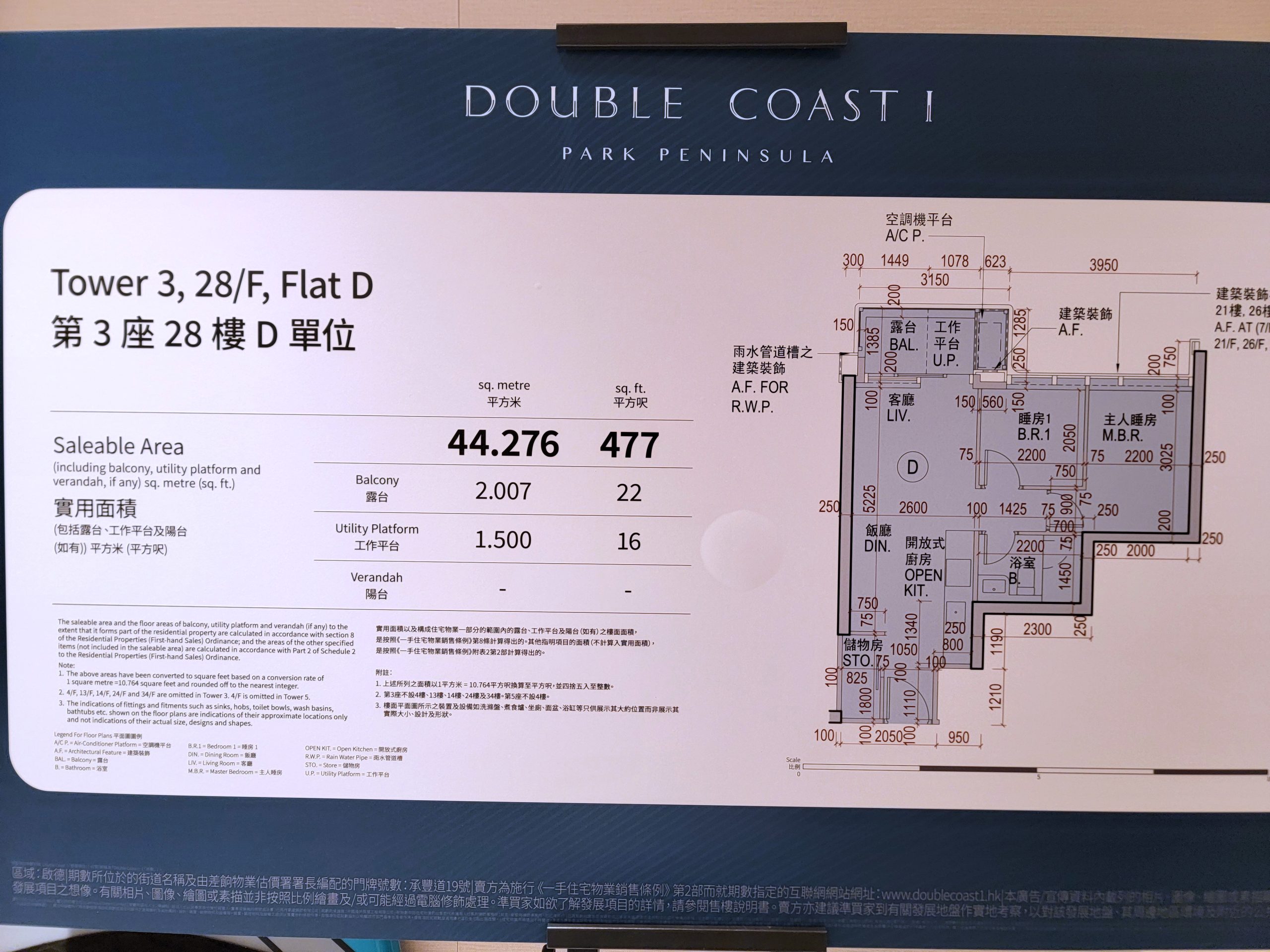 會德豐地產與恒基地產、中國海外發展及新世界發展合作發展、位於啟德海灣半島PARK PENINSULA現樓新盤「DOUBLE COAST I」開放全新海景現樓裝修設計單位,為第3座28樓D室,屬兩房連儲物房(開放式廚房)間隔,實用面積477方呎。