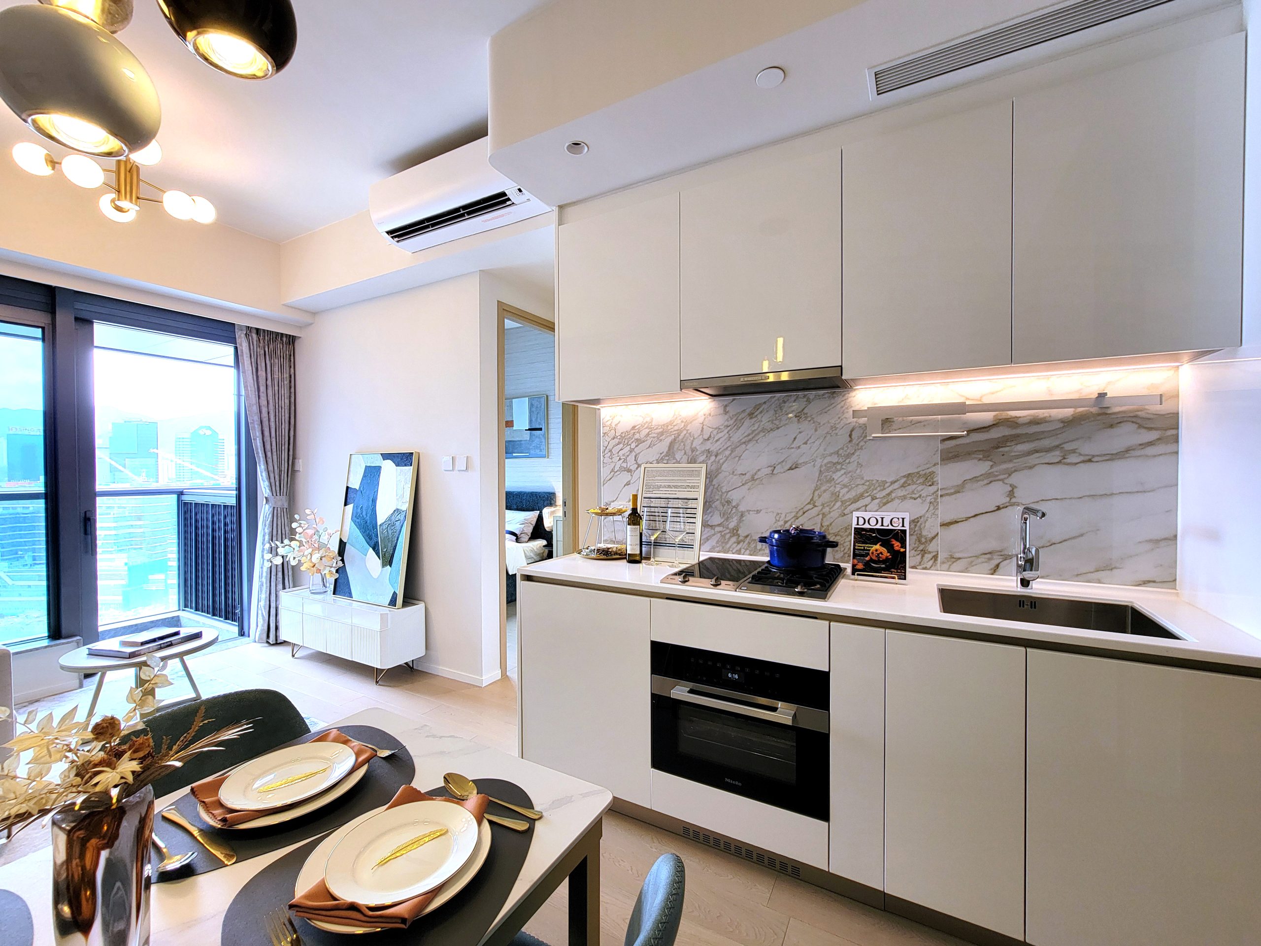 兩間睡房與客飯廳同一坐向,主人睡房間隔方正實用,放置衣櫃及雙邊床頭几,仍然空間感十足。單位更尊設儲物室,可靈活作衣帽間等用途。另外,開放式廚房設特長工作枱面,標準單位全數選用Miele煮食爐具、蒸焗爐。
