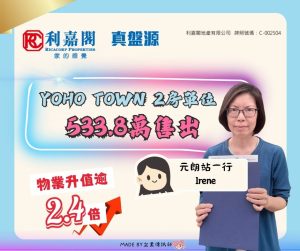 利嘉閣地產元朗站一行助理分區經理莫家進(Marco)稱,該行高級客戶經理譚玉鳳(Irene)最新促成元朗YOHO Town 1期7座中層H室的二手成交個案,單位實用面積約422方呎,屬2房間隔,望市景。