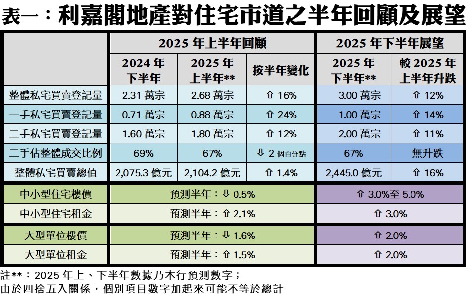 利嘉閣地產董事胡栢榮指出,2025年初,年關交替市況例淡,而中美一度爆發關稅戰也窒礙市場氣氛,惟「戰況」只屬雷聲大雨點少,未有對剛需為主的本地樓市造成嚴重衝擊,加上《財政預算案》放寬百元印花稅受惠範圍及近期拆息回落,均令樓市止跌回穩。綜合土地註冊處數據,2025年截至6月12日為止的上半年,整體私宅買賣登記共有23,449宗,涉及金額約1,985.09億元,預計整個上半年最終料達26,804宗及2,104.21億元,將較2024年下半年的23,112宗及2,075.30億元分別上漲16%及微升1.4%;量方面創下近7個「半年度」新高,金額則是近4個「半年度」次多。