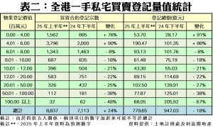 在二手市場方面,相信在下半年經濟持續好轉,股市及零售消費市道都向好及進一步的減息預期,也能帶動二手交投造好,料下半年二手私宅登記量將較上半年的1.80萬宗再升11%,至2萬宗水平;全年累計,二手買賣料錄3.80萬宗水平,將較2024年約3.22萬宗增加18%。綜合預計,在下半年一二手齊步向好下,整體私宅登記量料升12%,最終料達3萬宗水平;而全年總計料錄約5.68萬宗,將較2024年的約4.84萬宗漲17%。