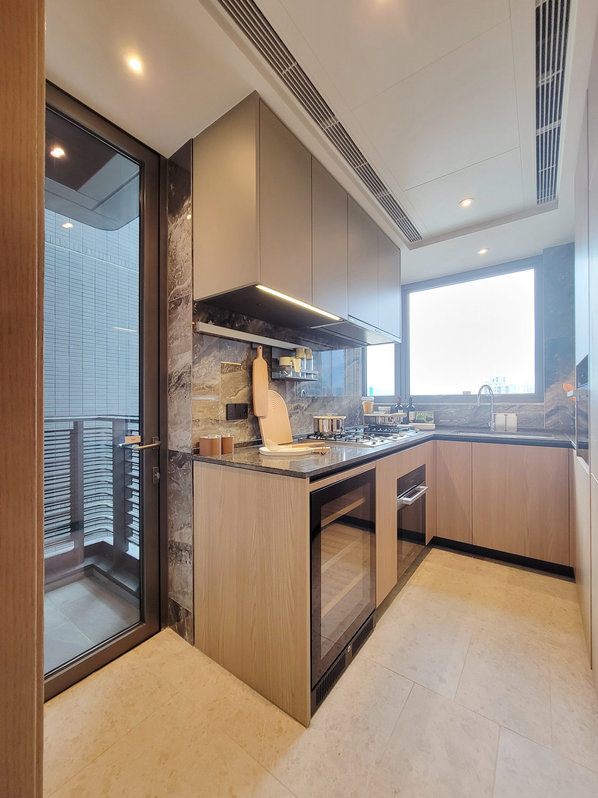 廚房屬梗廚設計,連接儲物室及洗手間,為住戶增添儲物位置,空間使用上更為靈活。偌大的工作檯面採用亮麗人造石材,牆身採用仿雲石紋理瓷磚鋪面,美觀耐用。廚櫃為意大利著名品牌Poliform,設有感應燈,方便煮食時隨時開燈,並配備多款歐洲品牌的電器及爐具,包括德國品牌Miele的抽油煙機、蒸爐、焗爐、電磁爐、炒鑊及雙頭氣體煮食爐,以及德國品牌Siemens的嵌入式雪櫃及洗衣乾衣機,更備有法國品牌Vinvautz酒櫃及意大利Gessi水龍頭。此外,廚房設有獨立冷氣機。