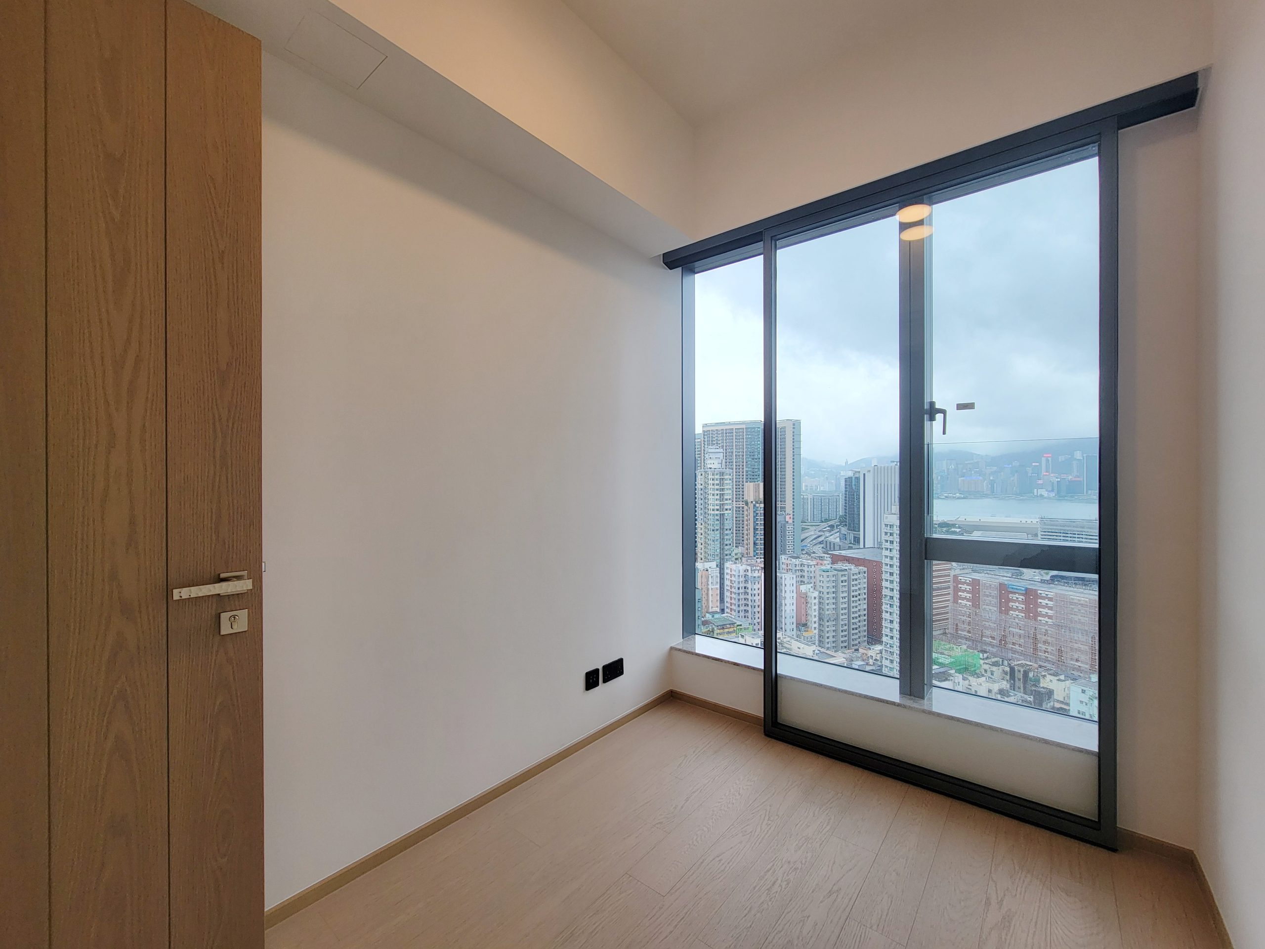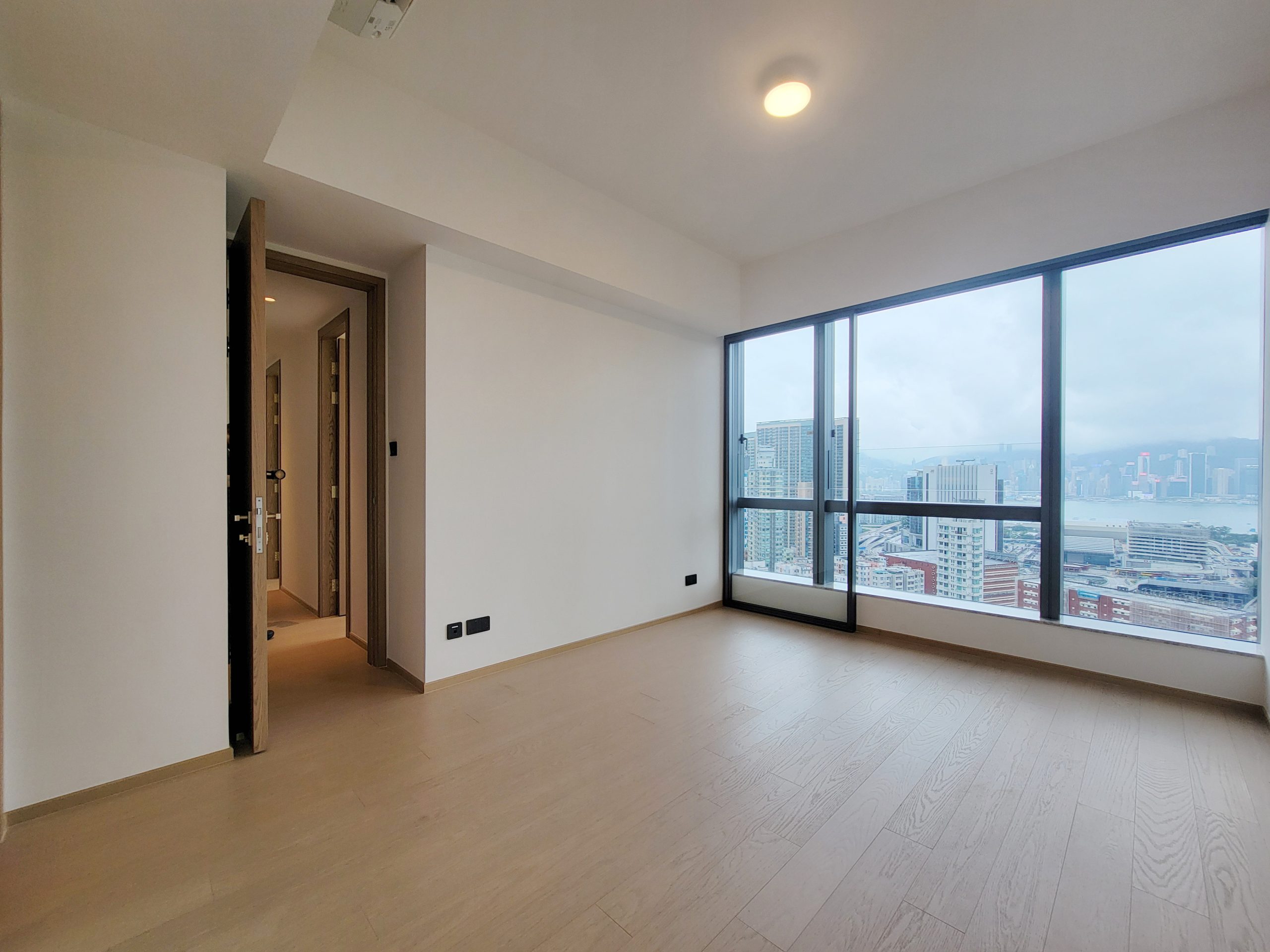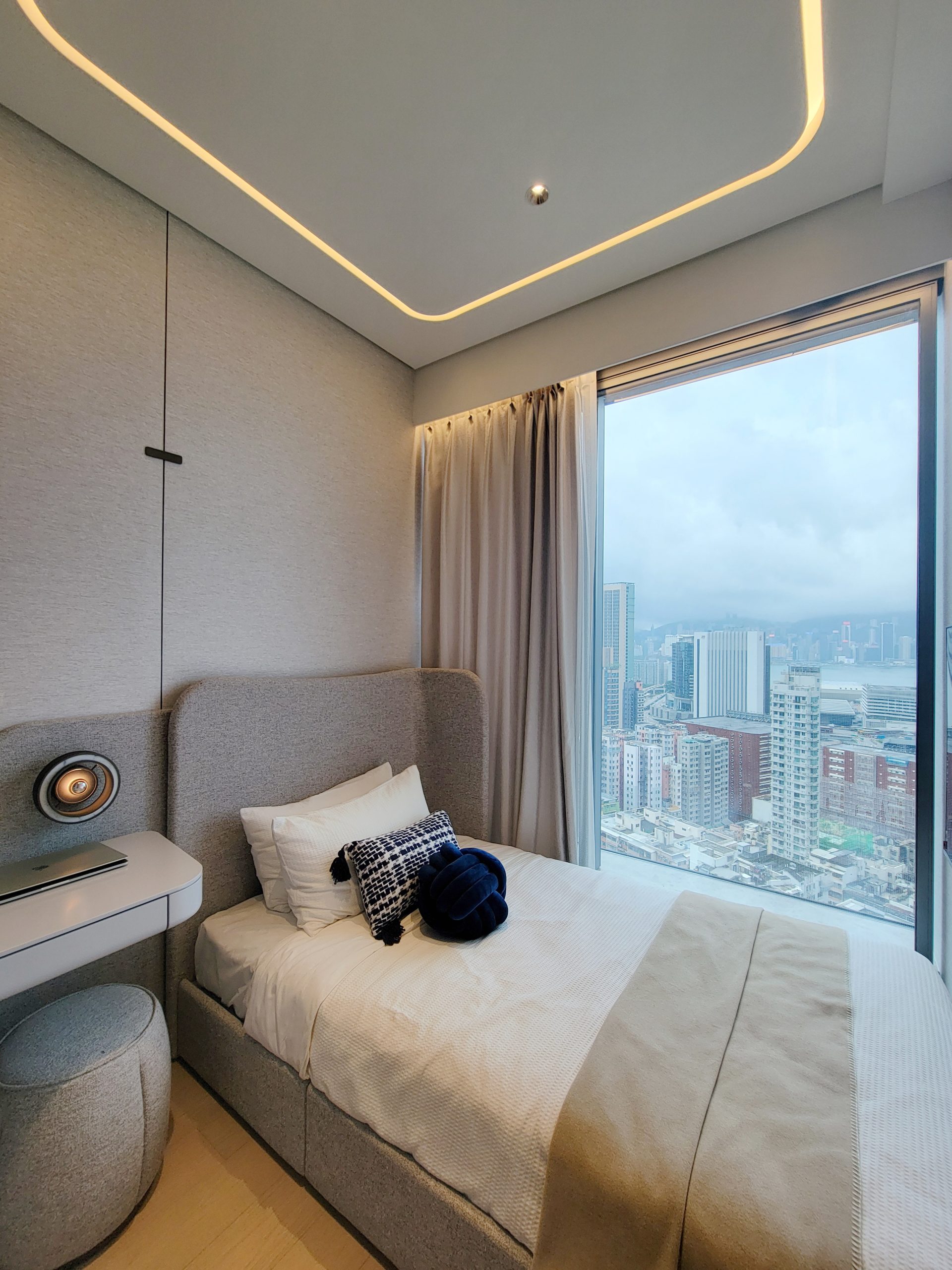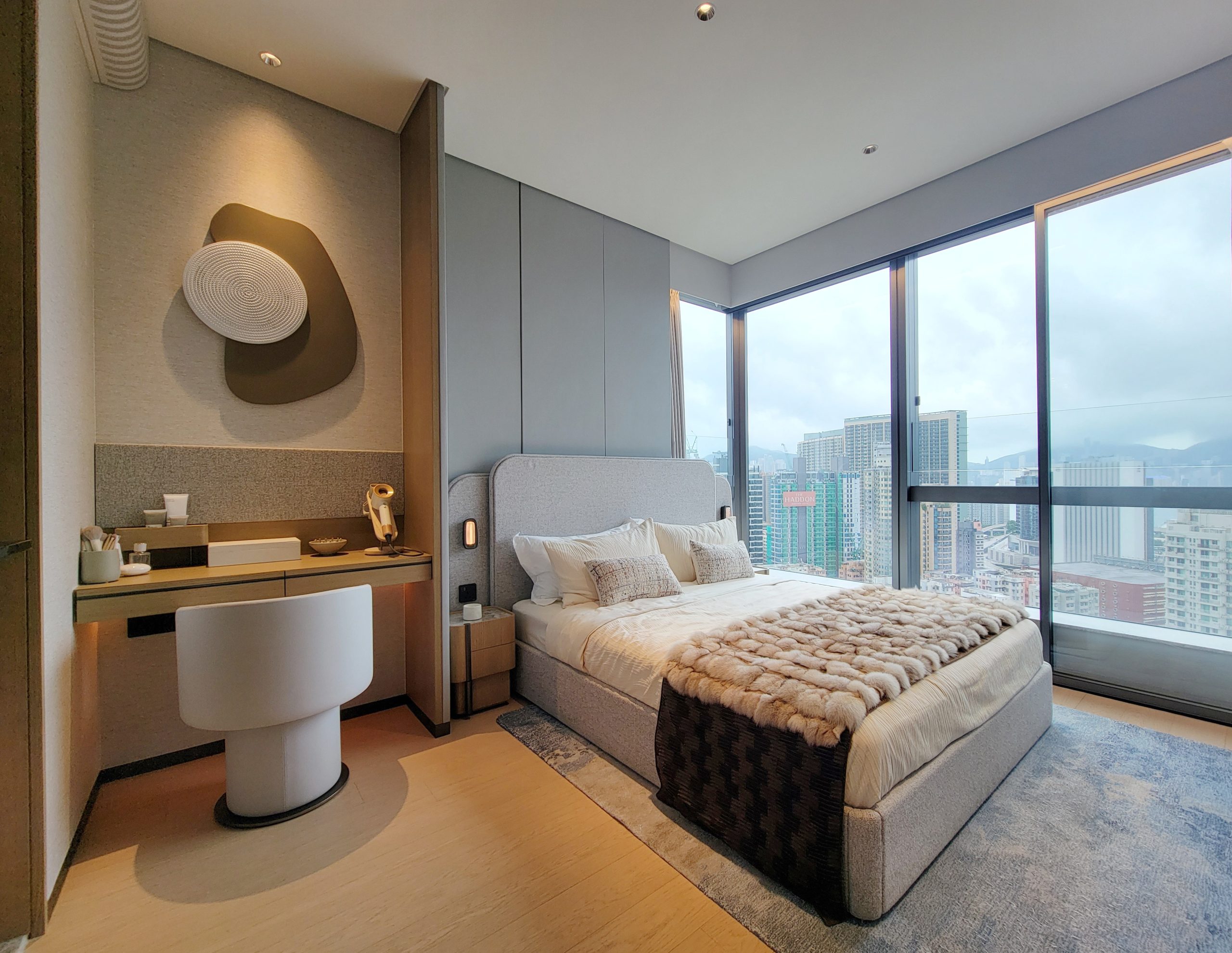 至於主人套房及睡房與客廳同向,特大窗戶有利採光,可以欣賞到醉人維港景色。主人套房擺放舒適的雙人大床,三邊方向均可輕鬆落床,兩側擺放著時尚的床頭桌,各有大理石桌面和現代感的黃銅裝飾燈。床尾的大型衣櫃設計模仿步入式衣帽間的奢華,藝術玻璃紋理的表面、金色織物鑲嵌、精緻雕刻金屬把手和內置感應燈光。高品質義大利滑軌確保順暢移動,內部設有玻璃隔板和皮革質感抽屜。