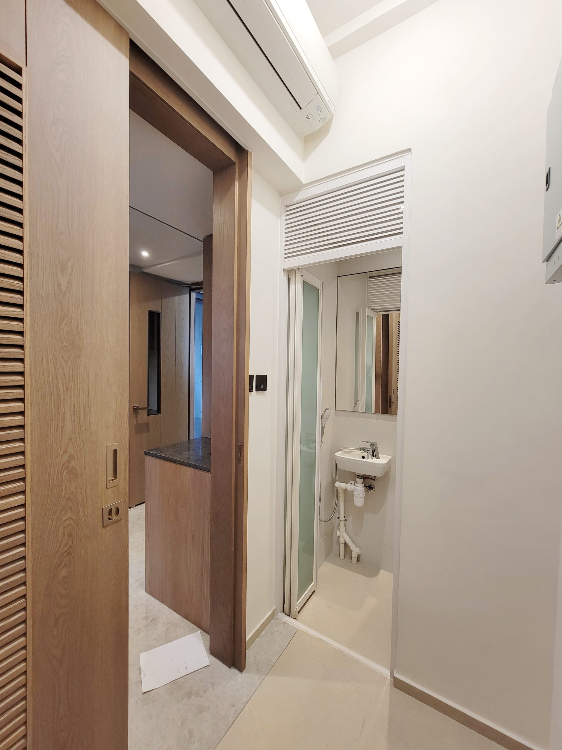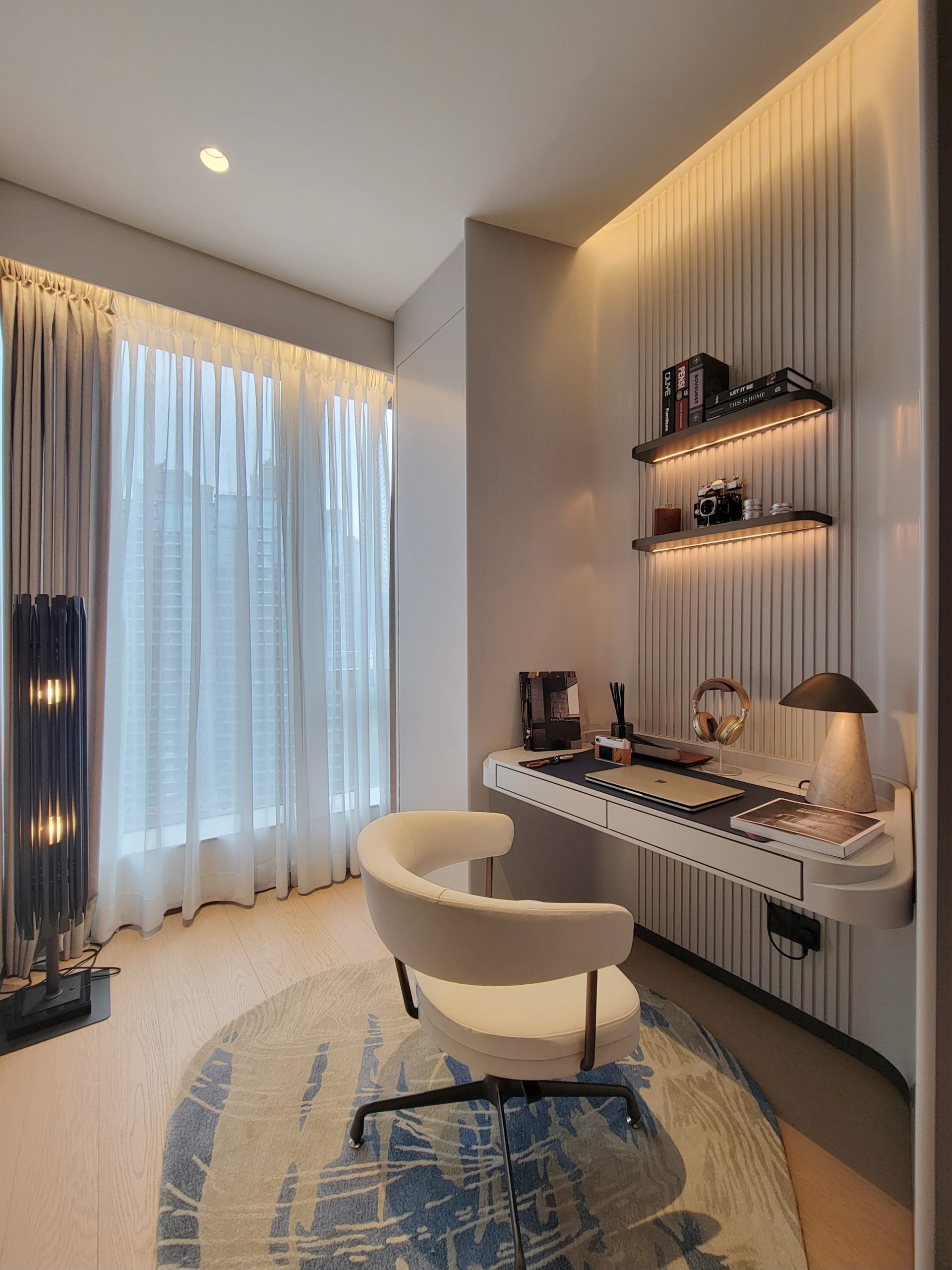 睡房內置衣櫃配玻璃門板提供充足的儲物空間,保持整潔和雅緻的外觀。衣櫃旁設有簡約而實用的書桌區,有效營造出一個溫馨和寧靜的私人空間。
