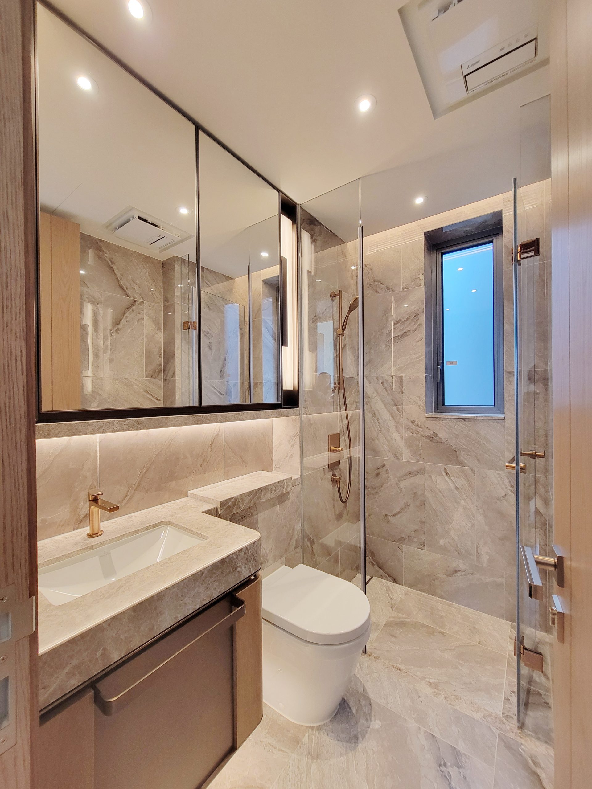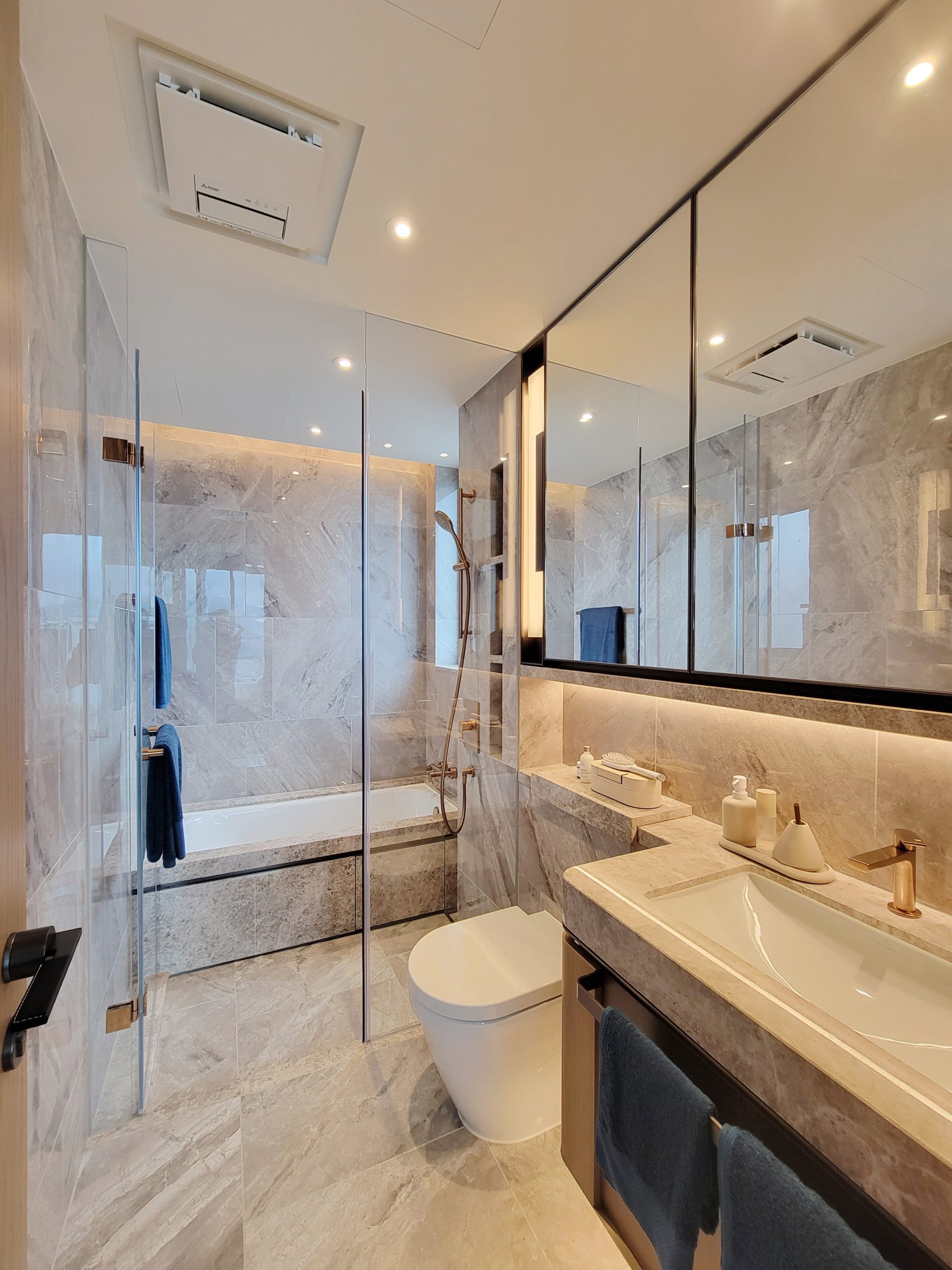 浴室及主人浴室均採用明廁設計,嚴選仿雲石紋理瓷磚打造牆身及地台,配備一系列國際品牌浴室設備,如德國品牌Villeroy & Boch座廁和洗手盆,以及意大利品牌Gessi洗手盆水龍頭和花灑套裝。主人浴室設有淋浴間及配備德國品牌Bette浴缸,讓戶主享有更優質的私人空間。
