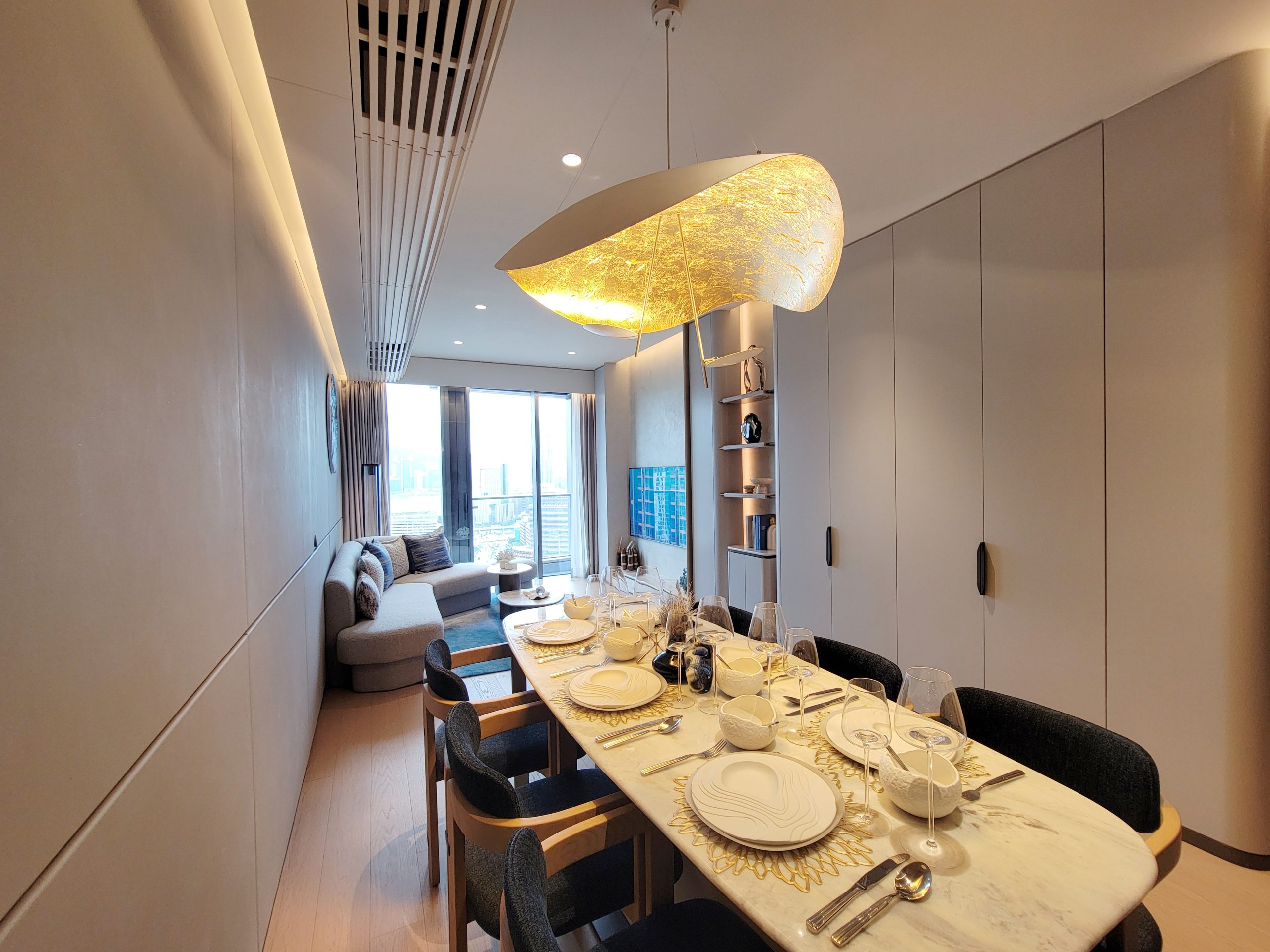 客飯廳為整個單位的「靈魂所在」,長形開則,間隔寬敞實用,長約7.2米、闊約3.25米,層與層之間的高度約3.225米,連接約27方呎露台,配以落地玻璃趟門,廣納自然光線。