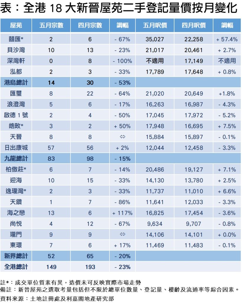 18新晉屋苑五月二手登記149宗 本月料闖高