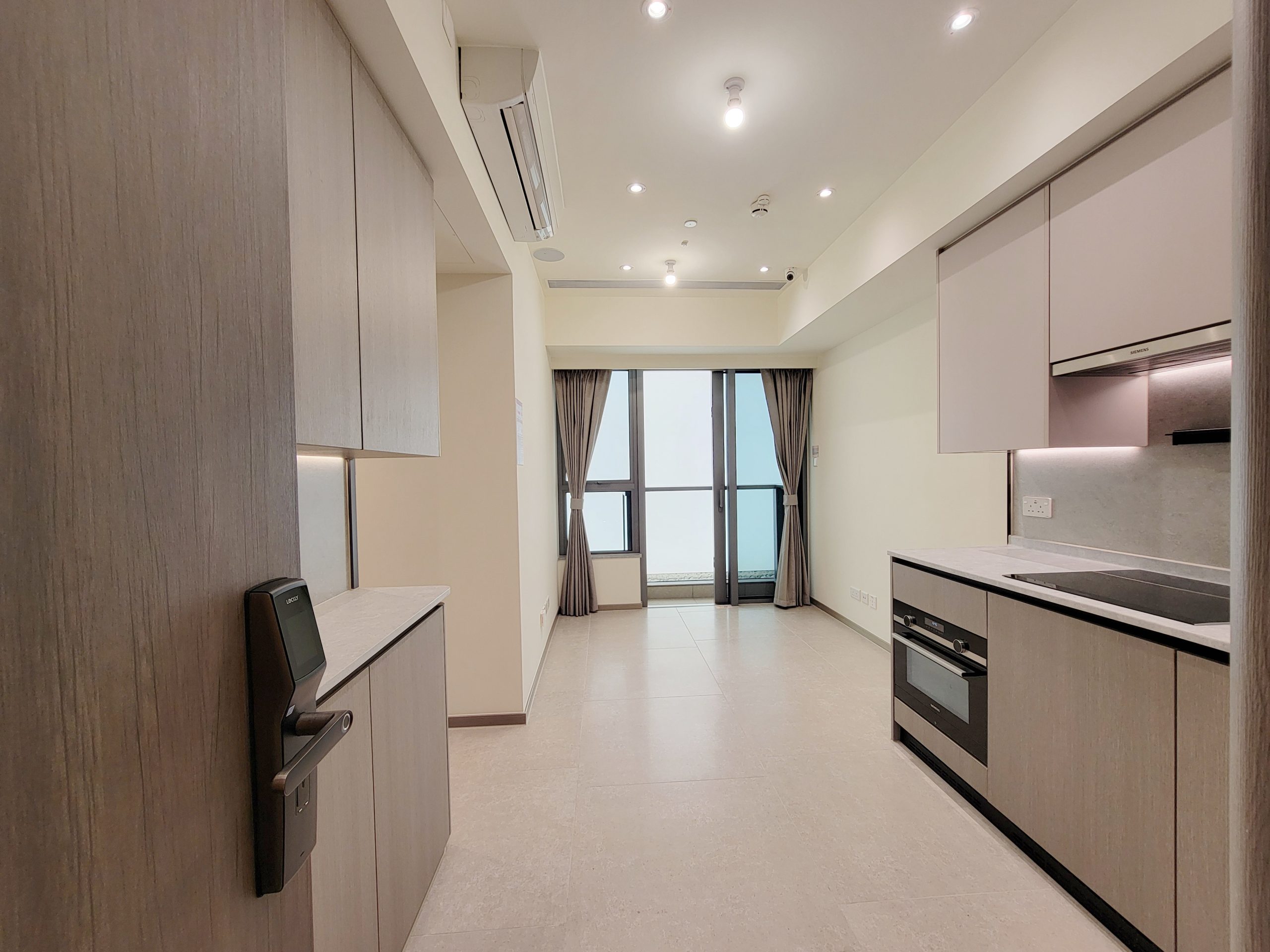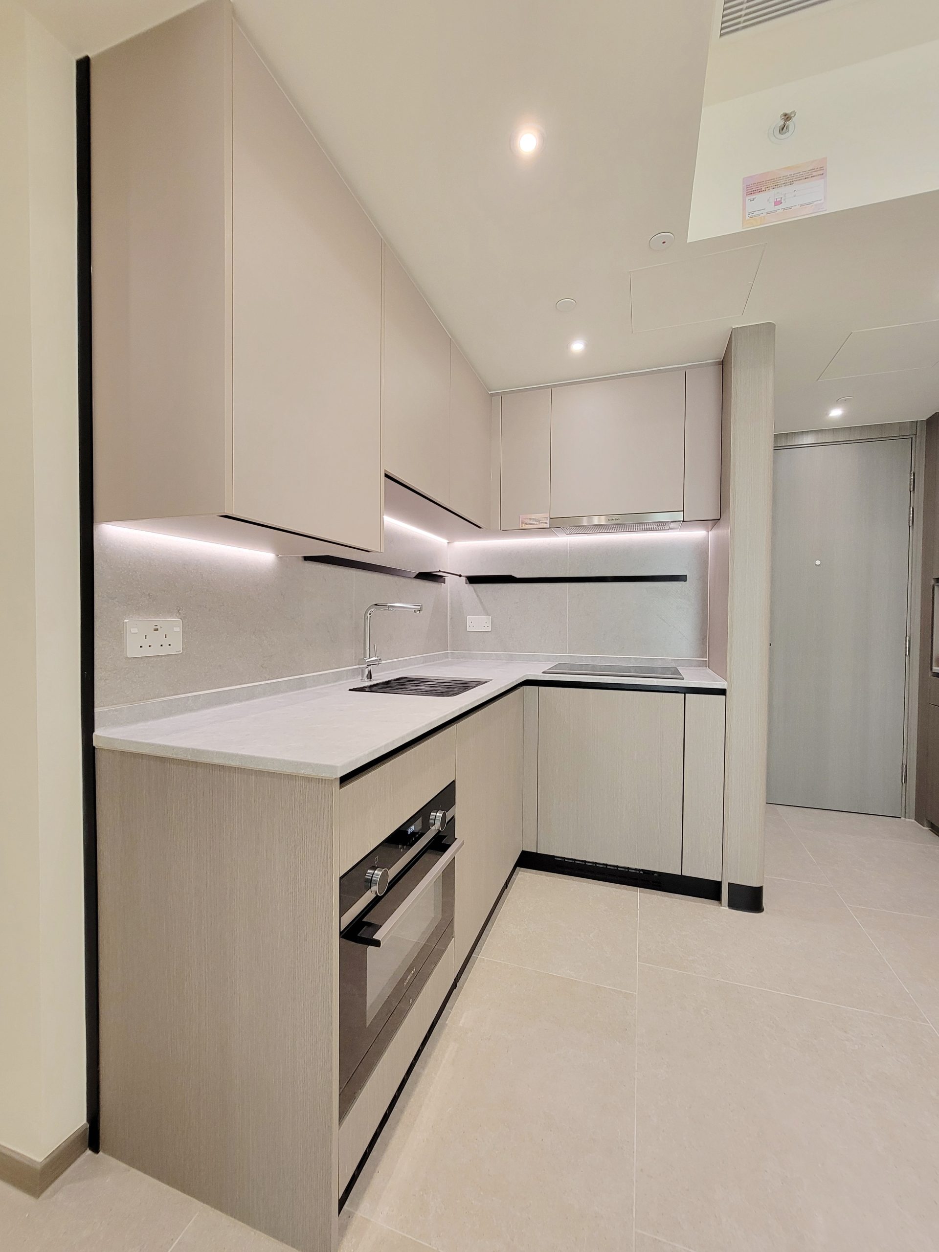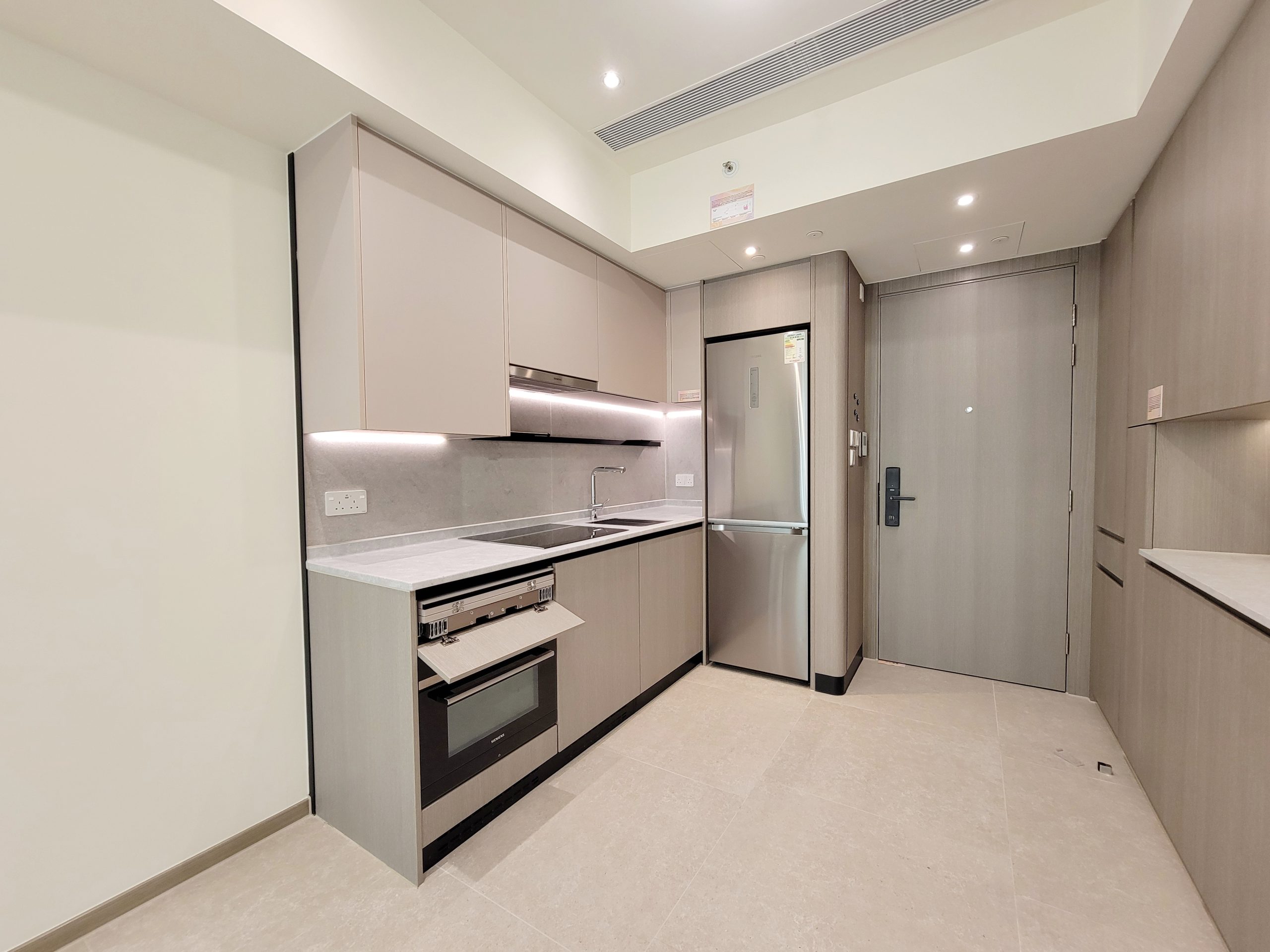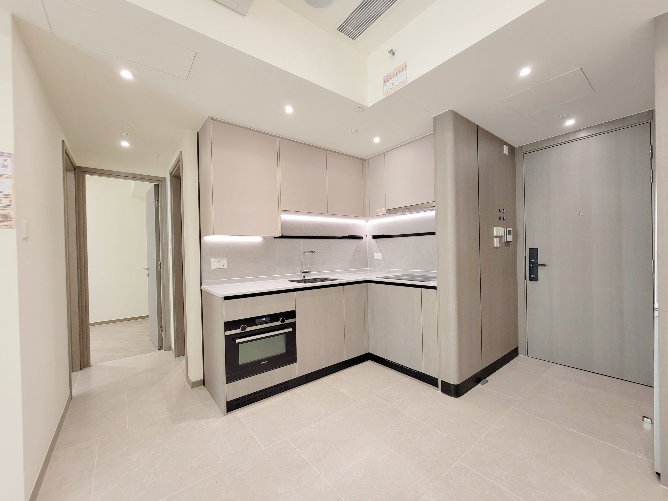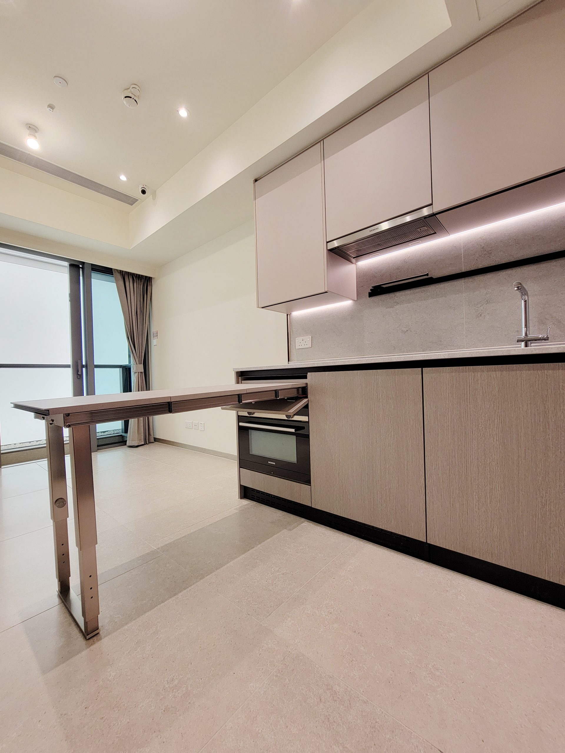 單位採用開放式廚房設計,設置長形工作枱面,牆上裝設置物架及設 USB 插頭的電插座。洗滌盤更貼心配備疏水卷軸,方便住戶作瀝水之用,細心照顧每一項細節。配襯淺杏灰色及木紋色廚櫃,廚櫃內設收納式摺疊餐桌,用餐時,住戶拉出餐桌,放置椅子後,即變成用餐區,靈活變化的設計可滿足不同空間使用需求。開放式廚房配備一系列專業廚房家電組合,包括Siemens七合一微蒸烤焗爐、電磁爐及抽油煙機;大容量Samsung雪櫃;嵌入式Whirlpool洗衣乾衣機,令空間更為優雅一致。