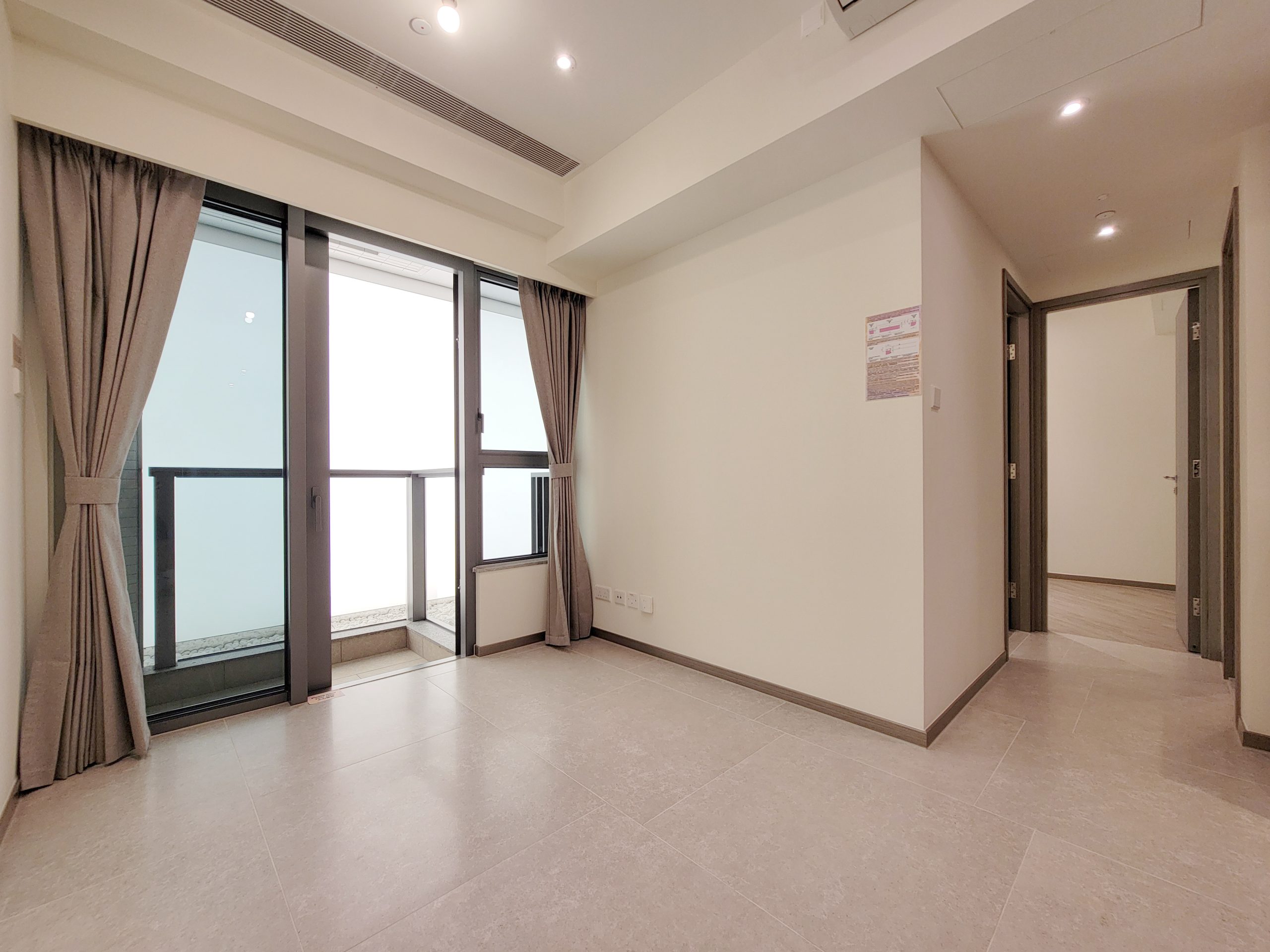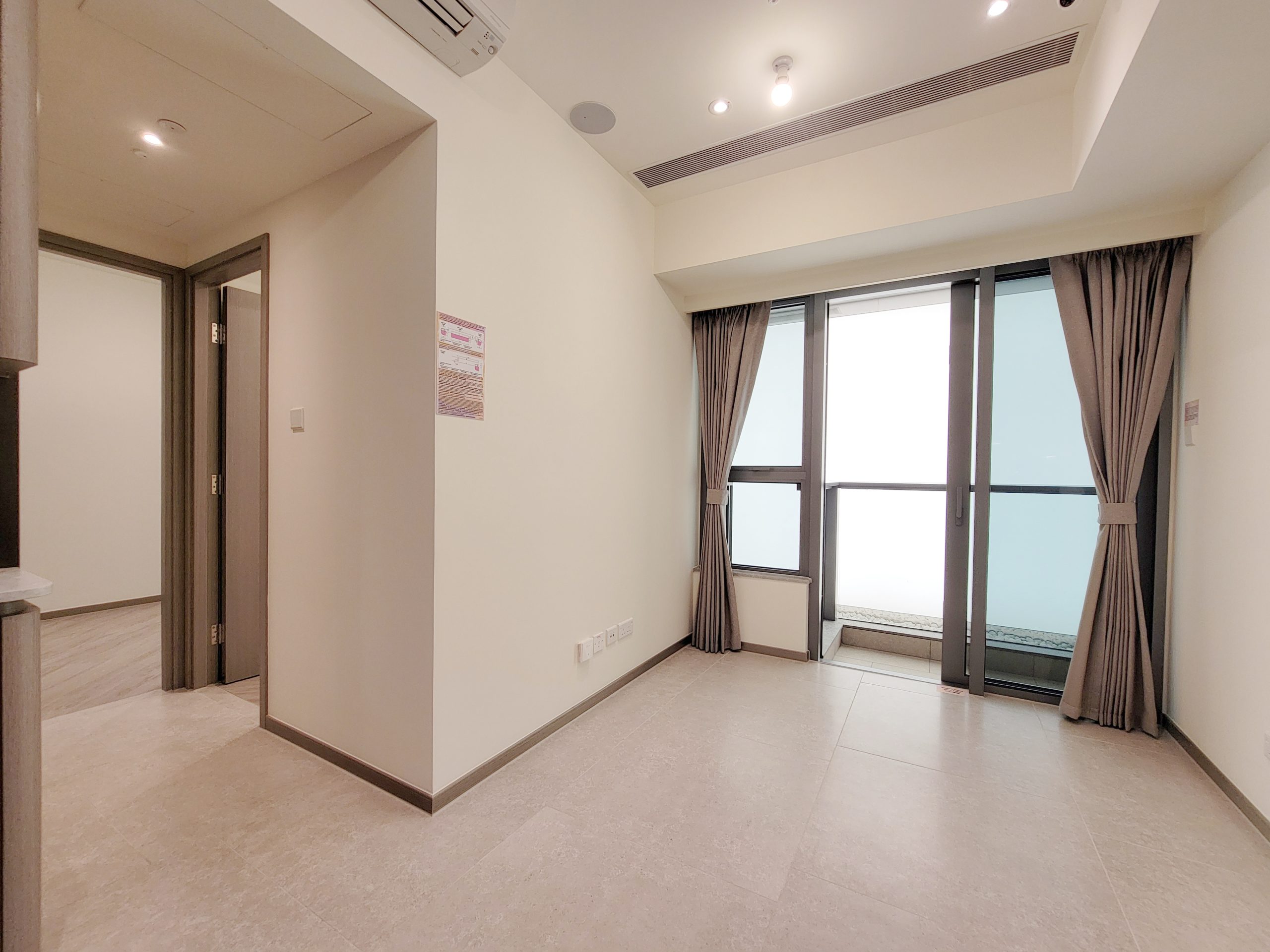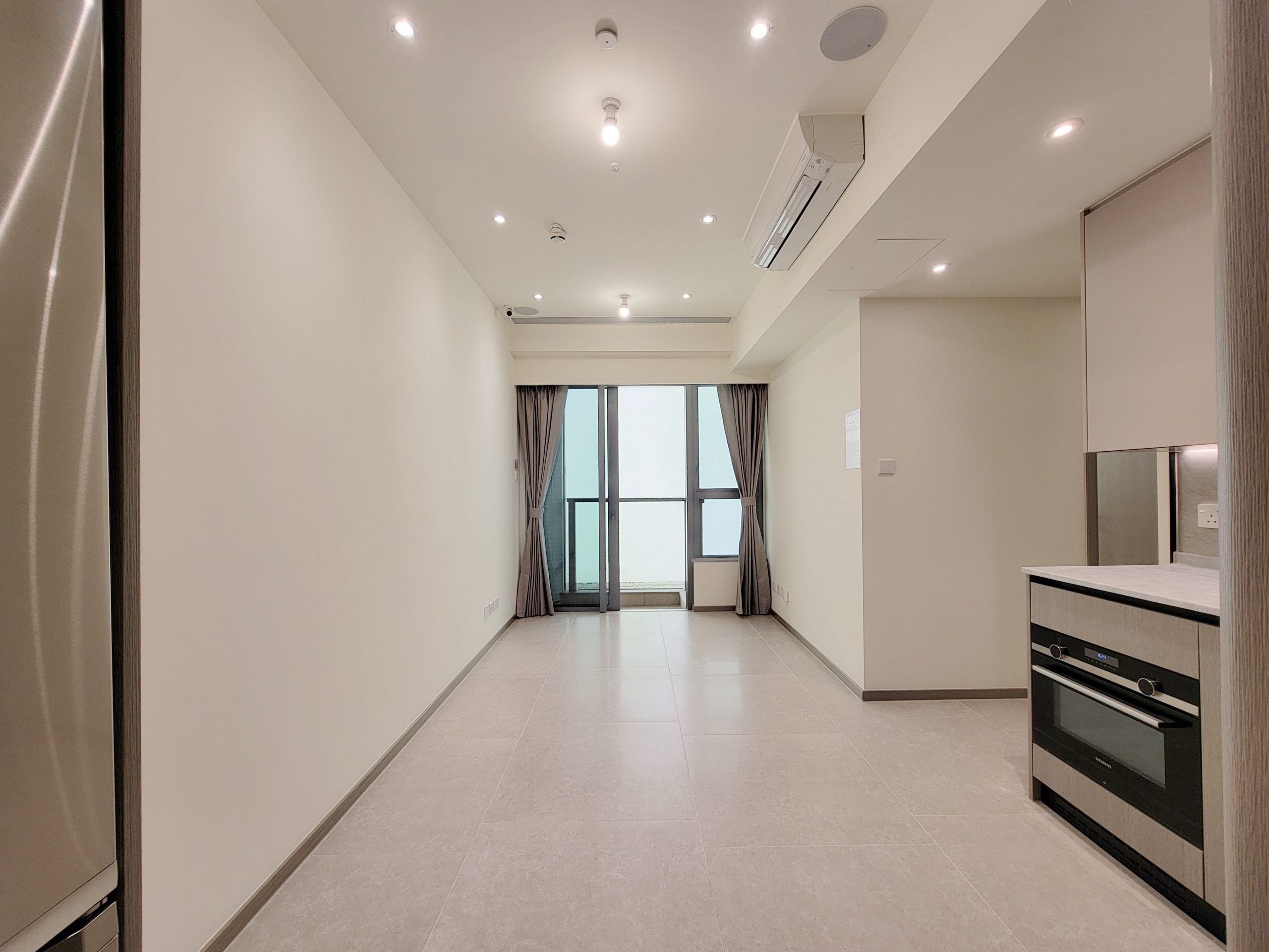 客飯廳呈長方形設計,長約5.87米,寬約2.45米,布局方正闊落,住戶可靈活擺放各式各樣的家具,滿足不同設計喜好。客飯廳連接露台,採用落地玻璃趟門設計,大大提高採光度,提升家居整體空間感,引景入室,讓住戶飽覽戶外景致,更已安裝遮光布藝窗簾,貼心實用。
