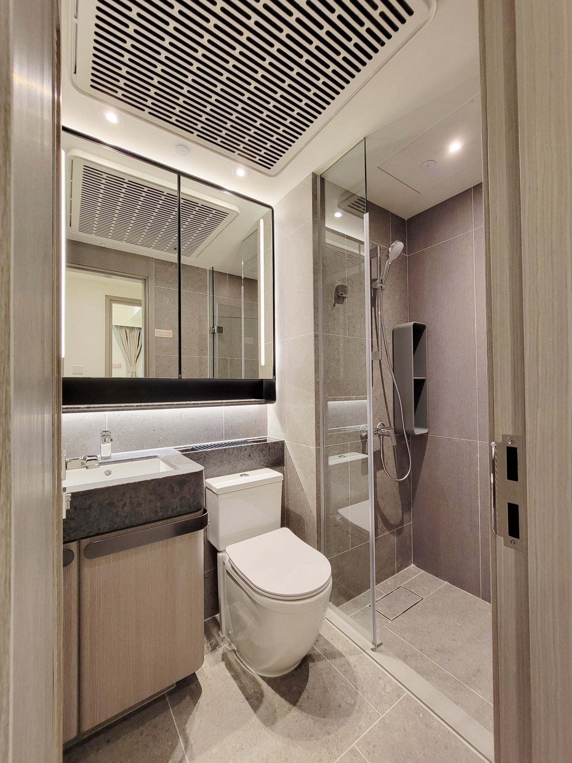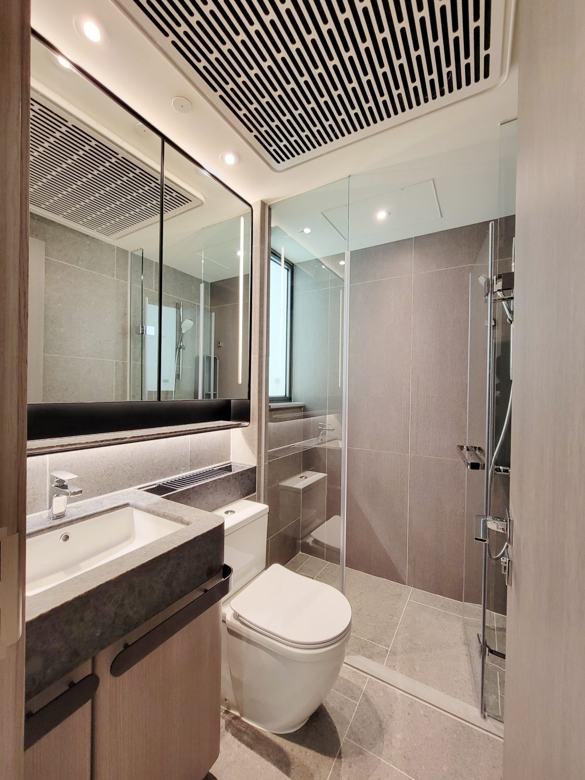 浴室地板採用灰色石紋設計,延伸至牆身,設有三件頭浴室配備,包括淋浴間、洗手盆及 坐廁,更裝設有暖風及殺菌功能之抽濕機,獲認證可有效殺滅新型冠狀病毒,同時亦設有抽氣扇,打造悠然舒適的淋浴空間。浴室亦貼心設置洗手盆櫃及鏡櫃,內設不同收納間隔,並設USB插頭的電插座,更備有掛衣繩,周詳安排住戶日常所需。