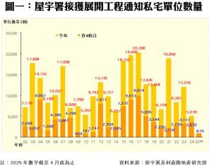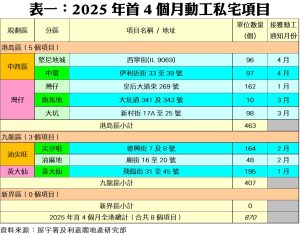 利嘉閣地產研究部主管陳海潮表示,縱使私宅動工量在低基數下按月增近八成,惟實際上開展動工仍較緩慢,根據屋宇署今日發表的最新數據,2025年四月份全港共有2個私人住宅項目,合共193伙動工(按屋宇署接獲上蓋建築工程動工通知為準),較今年三月份的108伙增加79%,另屋宇署修訂今年一月份動工項目,包括新增黃大仙飛鳳街31至45號(195伙)及刪減九龍塘界限街121號(2伙),今年首四個月私宅動工量累計870伙,較去年同期減少76%,創十五年同期新低;至於四月份動工項目包括中環伊利近街33至39號(97伙)及堅尼地城西寧街(內地段9069號) (96伙)。