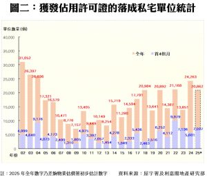 此外,私人住宅落成量方面,根據屋宇署今日最新發表的資料月報顯示,2025年四月份全港共有5個項目,合共1,610個私人住宅單位落成(以屋宇署發出佔用許可證的樓宇數量為準),按月減少19%,創七個單月最少;今年首四個月累計共7,097伙私宅落成,較去年同期的5,601伙增加27%。