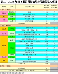 根據資料顯示,四月份本港共有5個私宅項目正式落成,當中規模最大的是長沙灣「Belgravia Place I期」,涉及714伙;其次為涉及658伙的油塘「親海駅II期」。至於,大角咀「利奧坊.首隅」(234伙)、深水灣道6號 (2伙)及何文田布力架街36A號(2伙)亦於期內竣工(詳見表二)。