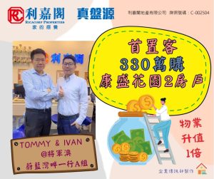 蔡氏表示,新買家為首置客,早前經利嘉閣真盤源平台搵樓,屬意單位間隔實用及裝修企理,且有小巴直達港鐵站,經代理介紹上址放盤及睇樓後。客人認為康盛花園價錢相宜,與家人商量後決定「上車」,於是向業主洽購,議價後以330萬元成交,折合實用面積呎價約7,301元。