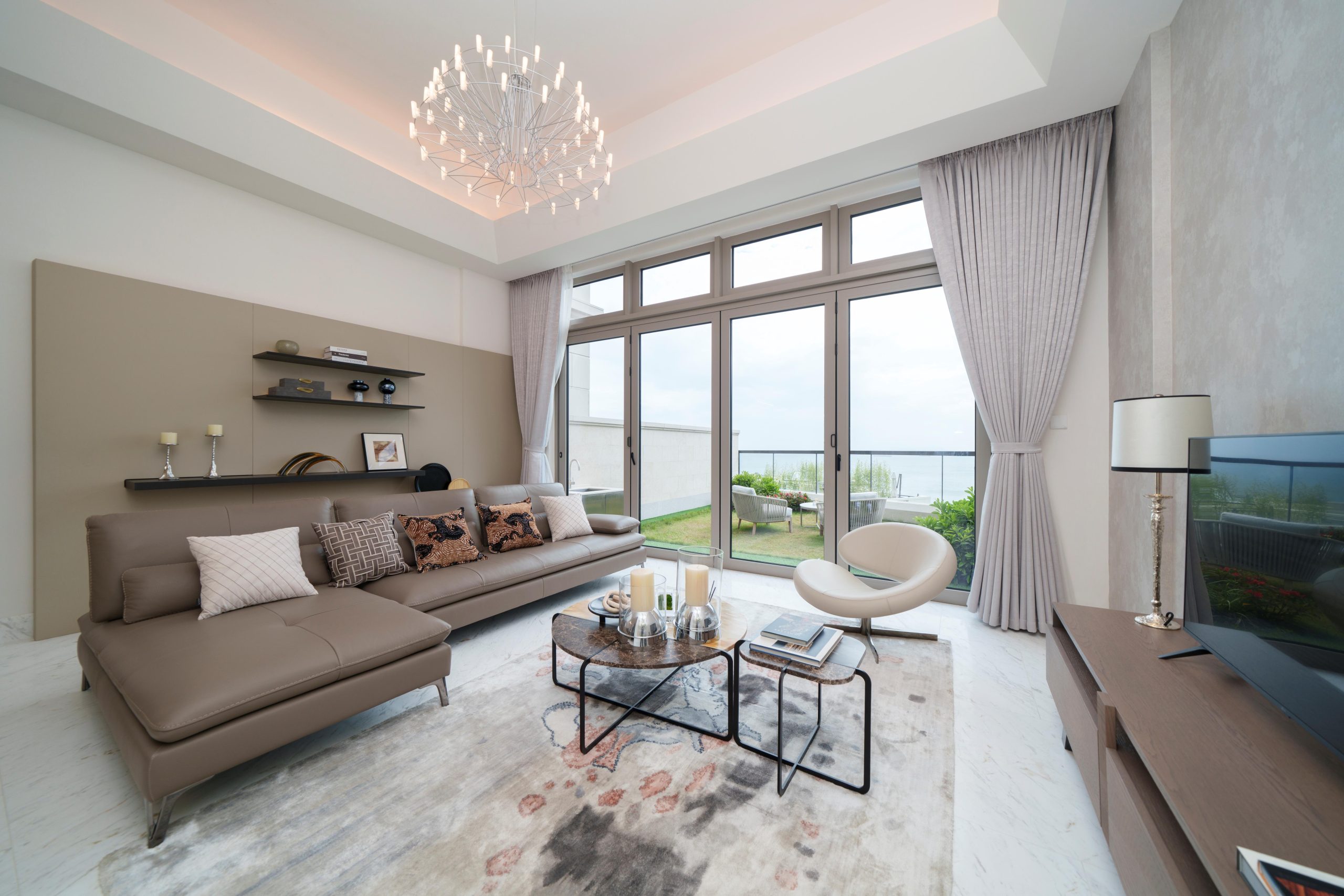 洋房設有地下、1樓、2樓,地下低層及天台,大門採用具備歐盟認證3級防盜等級之意大利高端大門OIKOS,單位設有私人升降機直達每一樓層,突顯洋房氣派。 地下大廳層採高樓底設計,層與層之間高度高達4.2米,氣度非凡。客飯廳空間分明,最長逾7米,最闊達5.7米,偌大廳堂擺放了多組奢華時尚的傢俱,仍顯寬敞。當中,客廳內的沙發來自法國頂尖傢俱品牌roche bobois及其著名藝術設計大師Sacha Lakic設計,配以大理石打造之特色茶几,成為客廳的亮點家具。特大落地玻璃趟摺門連接客廳與花園,前迎壯麗海景,同時把室外美景及園林綠化景致引入室內。