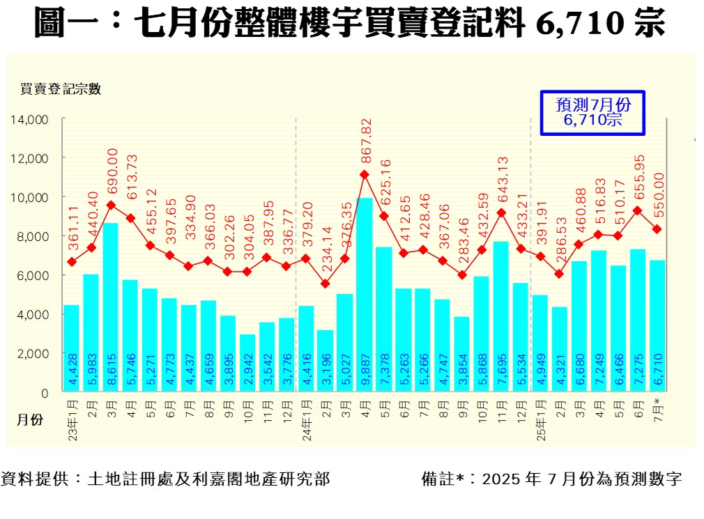 利嘉閣地產研究部主管陳海潮指出,關稅停戰,配合拆息回落,整體樓宇買賣即時彈升,惟盤源需時補充前,大市料得短暫回氣後才再儲力試高位。根據土地註冊處數據所得,2025年六月份全港共錄7,275宗樓宇買賣登記(數字主要反映五月中旬至六月上旬的樓市實際狀況),較五月份的6,466宗上升13%,在近月反覆表現之中創下近7個月新高;至於月內整體物業登記總值更創下自2024年五月以來的14個月最多,共錄得655.95億元,按月升29%。