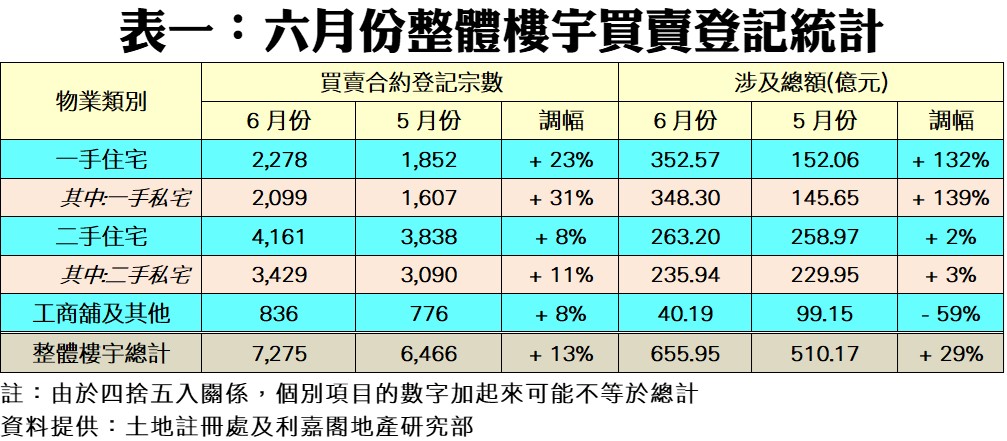 至於非住宅市場上月表現亦受惠整體大市向好,雖然佔比較重的車位按月錄得輕微跌幅,不過在工商舖三大範疇物業均全線上升,各自均達三位數字的登記量支撐下,造就六月份整體工商舖及其他買賣登記量按月升8%,錄得836宗;而月內買賣登記金額則因前月有商廈大額登記拉高基數,而背馳大減59%,只錄得40.19億元。