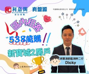 利嘉閣地產將軍澳蔚藍灣畔二行聯席董事鄭啟聰(Kason)稱,該行高級客戶經理王健鵬(Dicky)新近促成將軍澳坑口新寶城3座中層E室的二手成交個案,單位實用面積約434方呎,採2房間隔,外望內園景觀。