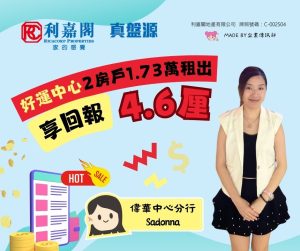 利嘉閣地產沙田-偉華中心分行聯席董事李偉佳(Michael)稱,該行資深客戶董事麥港慧(Sadonna)日前促成沙田好運中心竹林閣低層C室的二手租賃成交個案,單位實用面積約443方呎,屬2房間隔,望內園。
