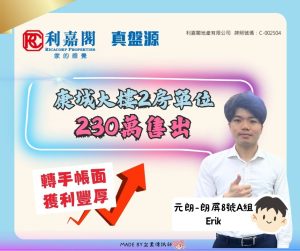 利嘉閣地產元朗-朗屏8號A組分行助理分區經理吳紫旭(Yoyo)表示,該行物業顧問謝佰成(Erik)日前促成元朗康城大樓高層2室的二手成交個案,單位實用面積約343方呎,屬2房間隔,望樓景。