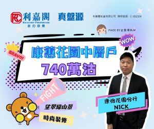 利嘉閣地產康怡花園分行聯席董事陳家豪(Ryan)稱,該行高級客戶董事吳一爍(Nick)新近促成鰂魚涌康蕙花園2座中層B室的二手成交個案,單位實用面積約604方呎,原則採3房1套間隔,外望開揚山景。