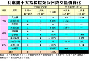 利嘉閣地產總裁廖偉強表示,發展商於一手新盤開價進取,在貨源選擇多、物業全新等優勢下,令二手市場交投仍處於「捱打」情況,加上二手業主議價空間有所收窄,導致二手市場潛在購買力繼續被攤薄。綜合利嘉閣地產分行網絡數據,在過去的周末(7月26至27日)十大指標屋苑錄得8宗二手成交,與對上一個周末(7月19至20日)的6宗,按周上升2宗或約33%。