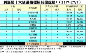 利嘉閣地產研究部主管陳海潮表示,樓市氣氛回暖,發展商魚貫推出新盤,二手低價盤源被大量消耗後未及補充,唯部分藍籌屋苑逆境跑出,續受買家垂青。綜合利嘉閣地產分行數據所得,全港十大活躍指標屋苑在上周(21/7–27/7)錄40宗買賣個案,較前周(14/7–20/7)的30宗急升33%,平均每個屋苑錄約4宗成交。