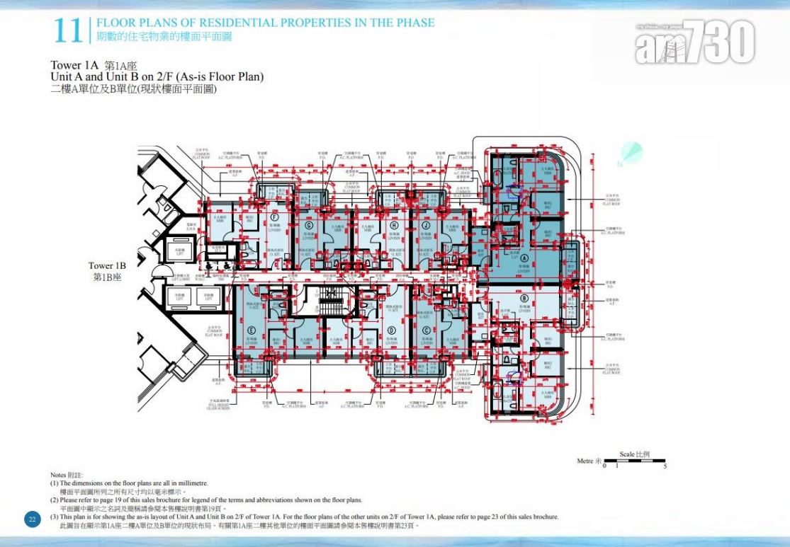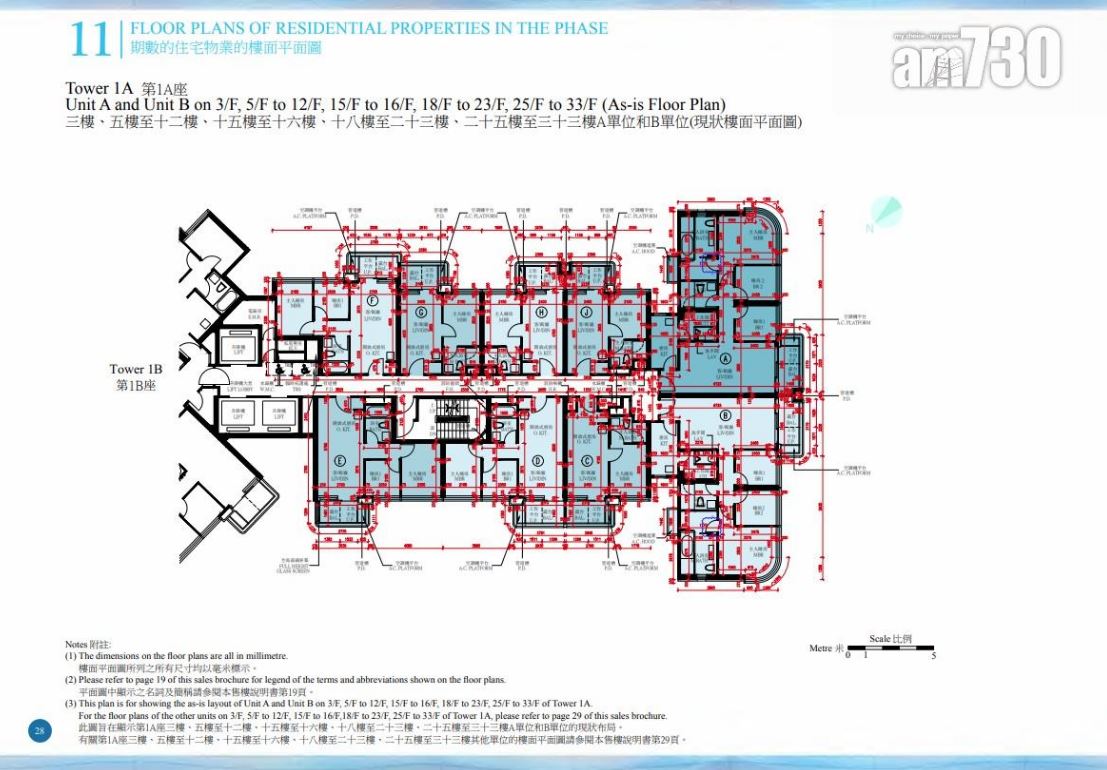 全盤面積最細為第1A座2至33樓J室,實用面積290方呎,一房間隔;而面積最大為第1A座35樓A室,實用面積1,908方呎,連308方呎平台及1,371方呎天台,屬四房三套加儲物室連工人套)間隔,亦為1A期唯一1伙特色單位,客廳及睡房3設有平台,內置樓梯前往天台。另外,第1A期設有257個住客車位,平均3戶爭1個車位。