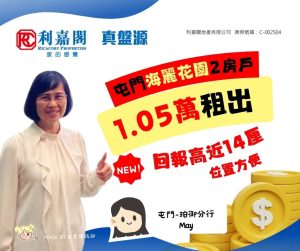 利嘉閣地產屯門-珀御分行高級經理陳志偉(Joe)稱,該行高級客戶經理羅素美(May)日前促成屯門海麗花園1座高層H室的二手租賃成交個案,單位實用面積約426方呎,屬2房間隔,外望開揚景觀。