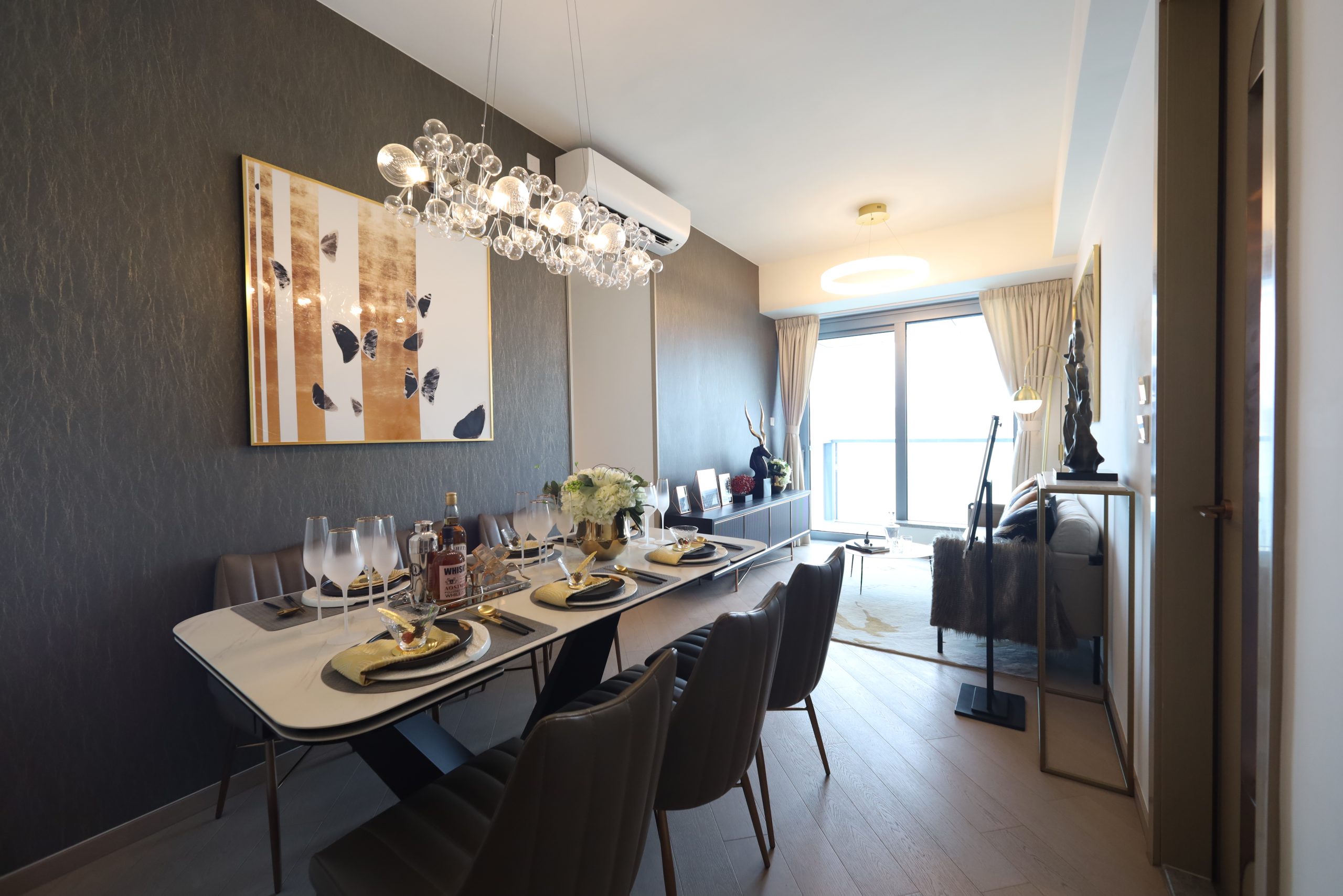 客飯廳的布局方正實用,並連接三合一之露台、工作平台及空調機平台,空間更廣,同時可享更多戶外休閒空間,檢查保養冷氣機亦更方便。單位空間奢華、高雅且精致,強調風格藝術、空間美學與舒適生活的完美結合。基調採用深棕褐色系,並以金銅橘色點綴,營造出專貴、活力與溫暖的氣息。工藝壁紙展示深邃色調,搭配閃爍金屬細節,與藝術雕塑及畫作相互輝映。用餐區選用大理石餐桌和古典絎縫皮革餐椅,兼具高級感與實用性,空間功能與美感氛圍完美融合。