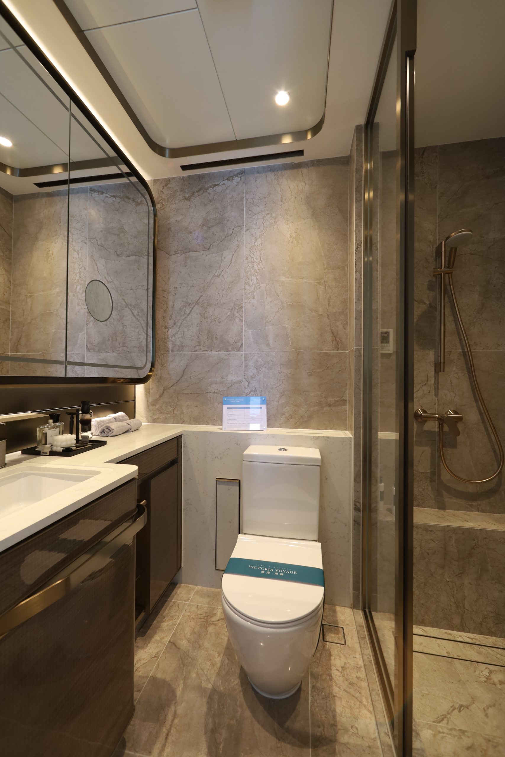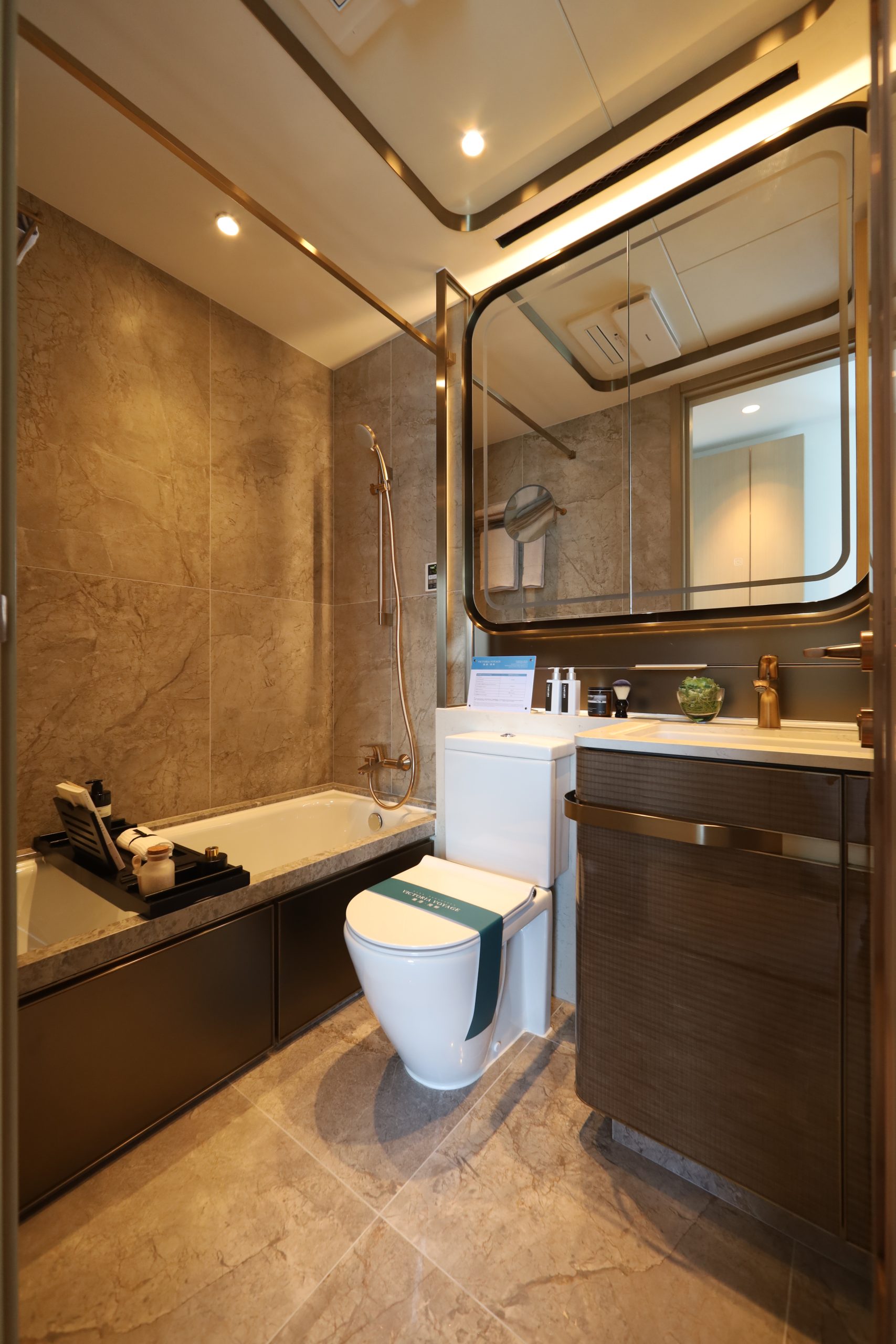 浴室則以暖啡色高級石紋設計,配有特色弧形鏡櫃及可調色溫的嵌入式燈帶,並 設置放大化妝鏡、毛巾架、飾物盆及儲物層架,美觀實用。衛浴設備包括德國品牌Duravit的浴缸及座廁、德國品牌Hansgrohe的花灑及水龍頭,以及日本品牌Panasonic的浴室寶和德國品牌BOSE的藍牙揚聲器,為住客帶來酒店式的享受。