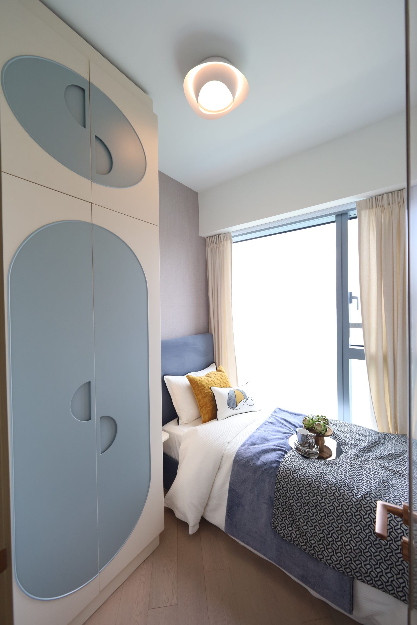 睡房設計強調都市靜謐,主人睡房配有落地玻璃,將自然光引入,讓景觀成為生活的一部分。以柔和灰藍及米白為主調,搭配金黃及深藍抱枕,營造溫暖的休憩氛圍。主人睡房設有量身訂造的全高衣櫃,內置梳妝台,兼具實用性與隱藏收納, 提升空間感。書房巧妙融入水墨書法元素,展現雅緻文化感,書櫃的不規則幾何 設計成為藝術焦點,書桌臨窗引入自然光,營造舒適的工作環境。 廚房為梗廚設計,組合櫃以仿皮紋及金屬漆飾面,石紋枱面,並設有實用的訂製裝置,包括掛架、調味料瓶及多用途砧板等。高級歐洲品牌家電,包括德國品牌Miele抽油煙機、雪櫃連冰箱、炒鑊氣體煮食爐、雙爐頭氣體煮食爐及蒸焗爐、Siemens的洗衣乾衣機,為生活品味樹立新標準。
