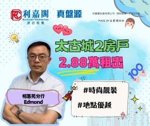 利嘉閣地產康怡區助理營業董事丁培鴻(Sam)稱,太古康怡區栢蕙苑分行高級客戶董事黃俊雄(Edmond)日前促成太古城寶山閣高層H室的二手租賃成交個案,單位實用面積約598方呎,採2房間隔,外望開揚景觀。