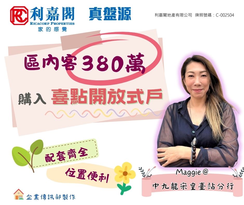 利嘉閣地產中九龍-宋皇臺站分行經理林玉燕(Maggie)(圖)稱,該行新近促成土瓜灣喜點高層G室的二手成交個案,單位實用面積約259方呎,採開放式間隔,向東南,外望開揚景。